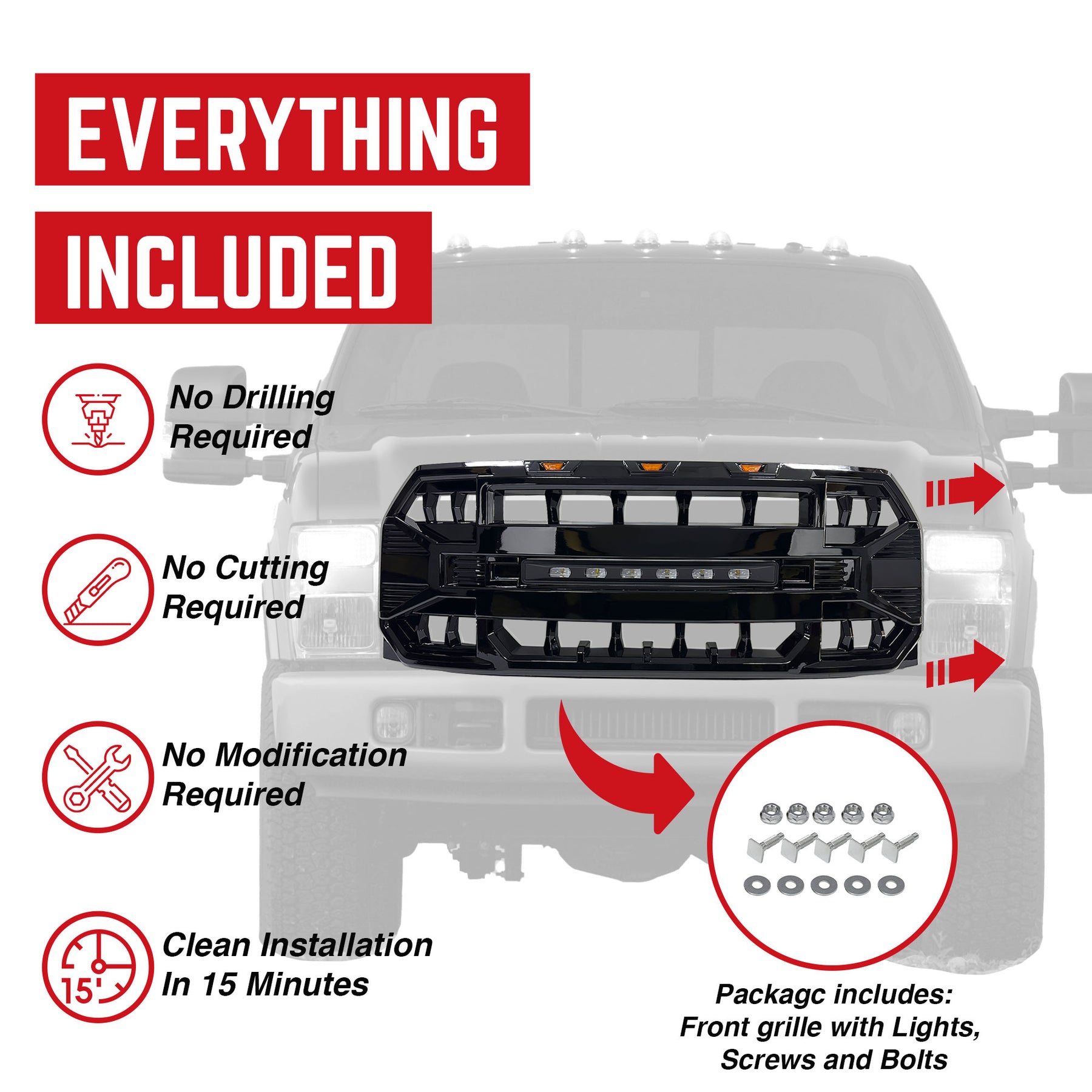 • Replacement grille compatible with FORD F150 2015, 2016, and 2017, including XL, XLT, Lariat, and FX4 (NOT FIT SVT Raptor); Check with the manufacturer for a proper fit