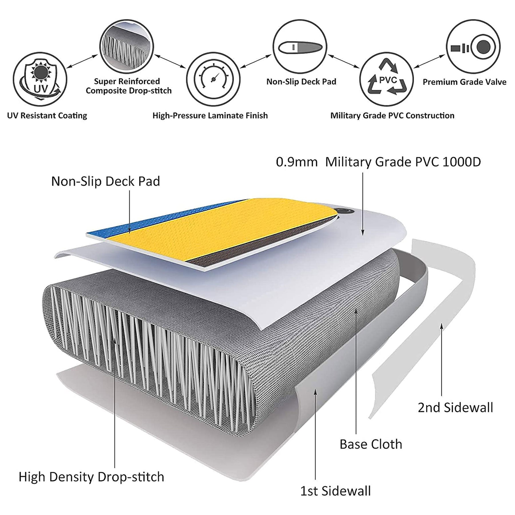 • Durable PVC construction with a drop-stitch inner structure maintains its shape and has a non-slip deck
