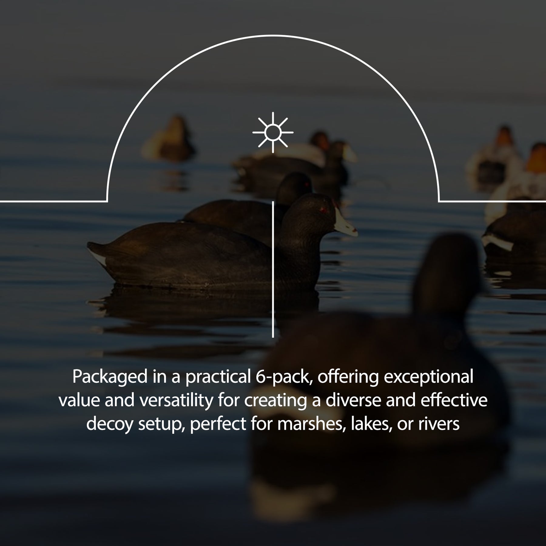 • Packaged in a practical 6-pack, offering exceptional value and versatility for creating a diverse and effective decoy setup, perfect for marshes, lakes, or rivers