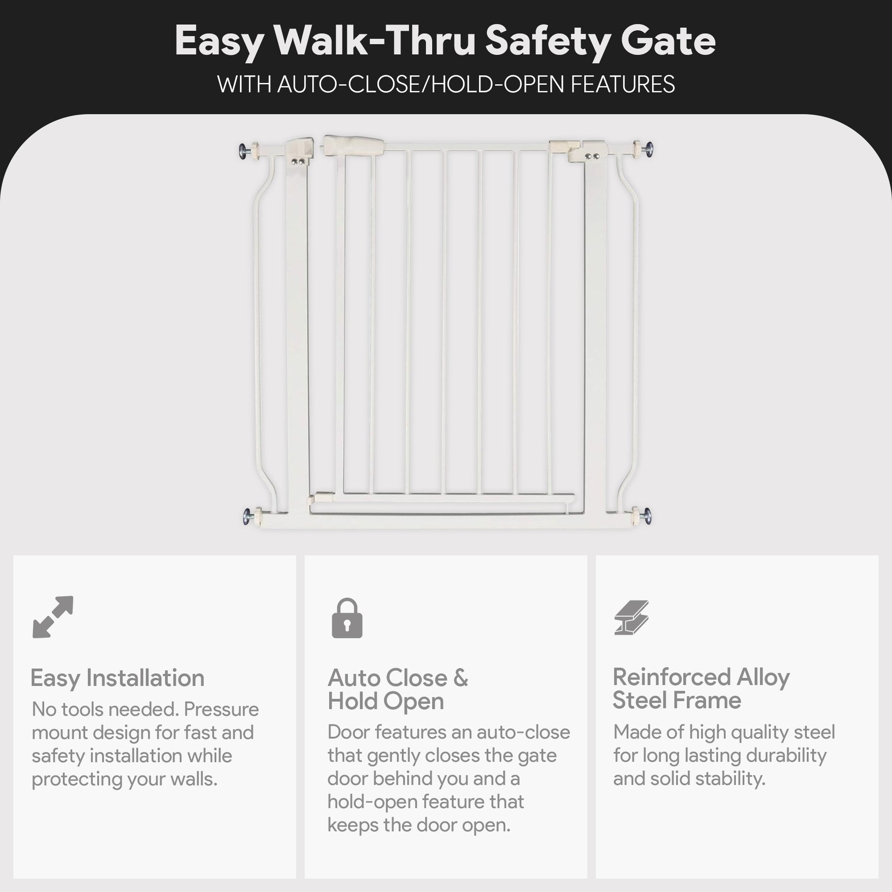 • Hold-open and auto-close design makes maneuvering the gate while carrying your tot a simple task