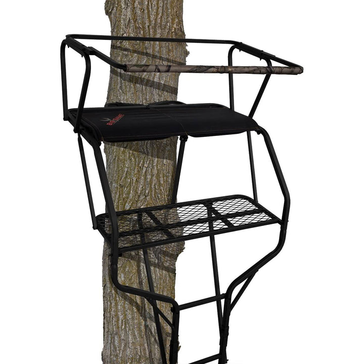 Silence, safety, and stability are essential when it comes to hunting. Accomplish all 3 with this 18-foot-tall portable tree stand ladder. Equipped with safety and assembly hardware, you're guaranteed to have the best seat. Heavy-duty rigid DXT steel construction and full body arrest system support 2 hunters up to 500 pounds. Once you've fastened the hunting ladder, scale up and get comfy on the extra supportive Flex-Tec seat. The padded flip-up shooting rail offers additional safety and extra steady anchorage. Use the wide footrest and enjoy the view for a stress-free day in the great outdoors. This means more time spent hunting and less time fumbling with complicated equipment.