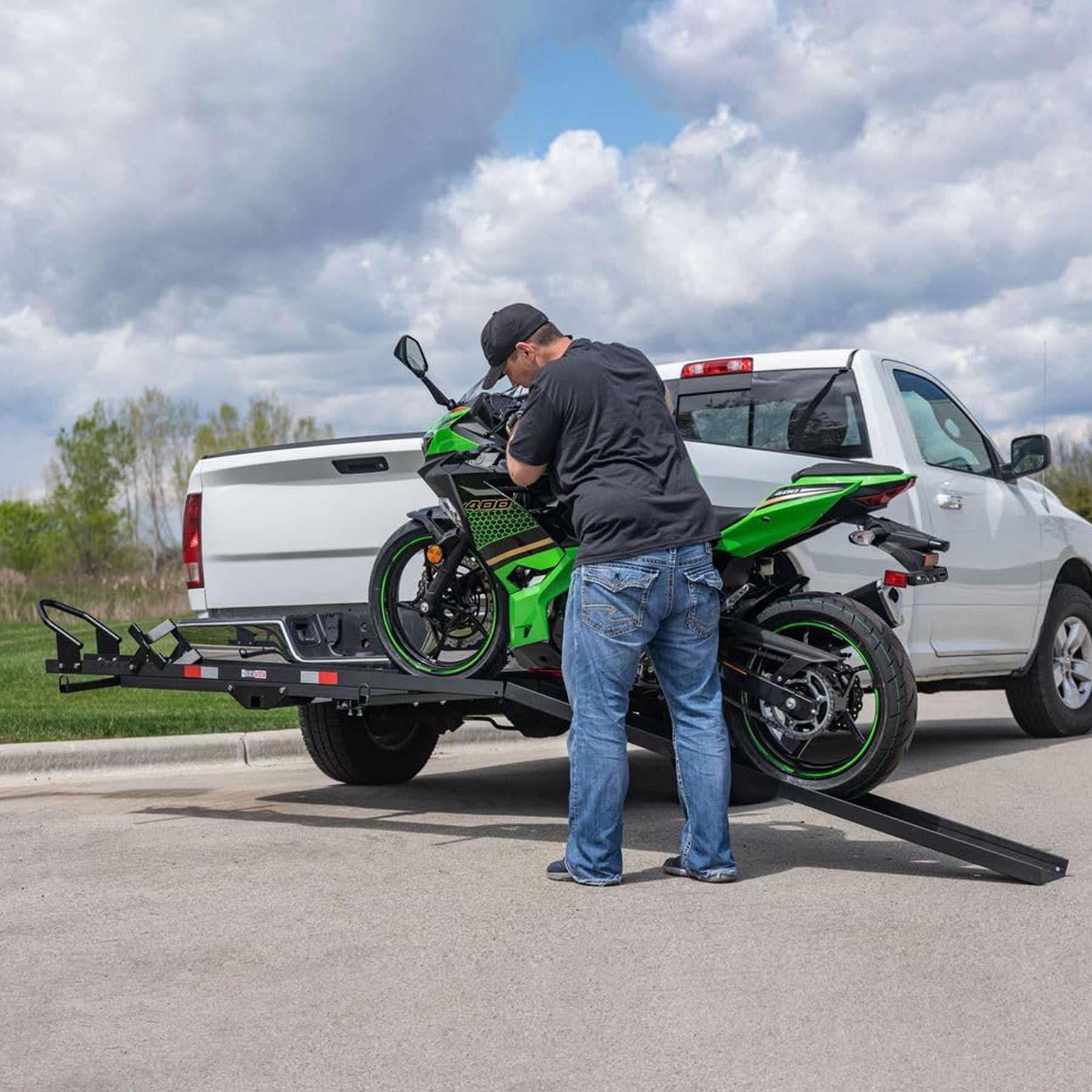Loading and unloading your road bike is effortless with the included roll-on, roll-off ramp, which should be installed on the right side of the carrier. When not in use, the 98-pound ramp can be stored on the carrier when not in use for compact storage. Designed for wheels up to 7.25 inches wide, this carrier easily accommodates motorcycles, dirt bikes, and scooters. For added safety, tie-down straps (sold separately) can be used to further secure your load. Please note, 200mm tires are not compatible with the track width of this carrier.