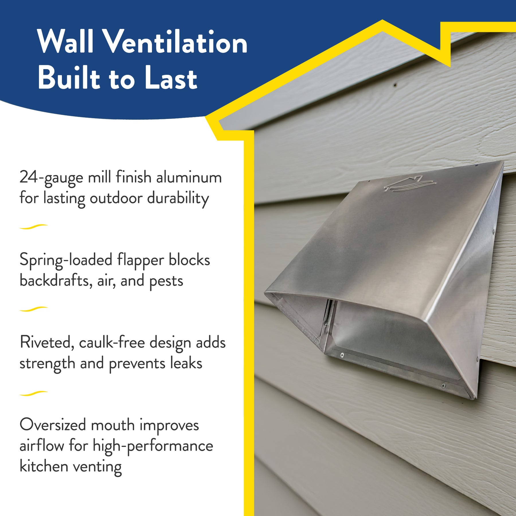 • Crafted from 24-gauge mill finish aluminum, the Outdoor Wall Vent Hood is built for extreme durability and long-lasting outdoor performance in all weather conditions