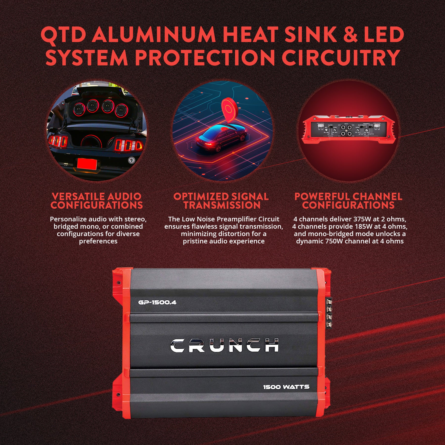 Ensuring immaculate signal transmission and minimal distortion, the Low Noise Preamplifier Circuit is complemented by premium RCA inputs, averting interference, and adaptable high-level Inputs for OEM systems. Select from Stereo, Bridged Mono, or both simultaneously, and refine settings with Variable Electronic 12dB crossovers and a fully adjustable 12dB Electronic Equalizer. Experience unmatched power and clarity with (4) 375-watt channels at 2 ohms, and (4) 185-watt channels at 4 ohms. Additionally, the unit can operate in a 750-watt channel (mono bridged) at 4 ohms for dynamic mono configuration. Powered by Class A/B topology and featuring Power Drive, the amplifier ensures high sound quality with minimal distortion. Exclusive Crunch SPEED-FET MOSFET components enhance efficiency, and the QTD Technology Aluminum Heat Sink guarantees cool operation with imperceptible distortions. The High Energy Pulse Width Modulated Power Supply ensures efficiency with minimal impact, while nickel-plated brass terminals maintain secure connections through screw-down connectors. Monitor overload and speaker short protection with LED System Protection Circuitry Diagnostics.