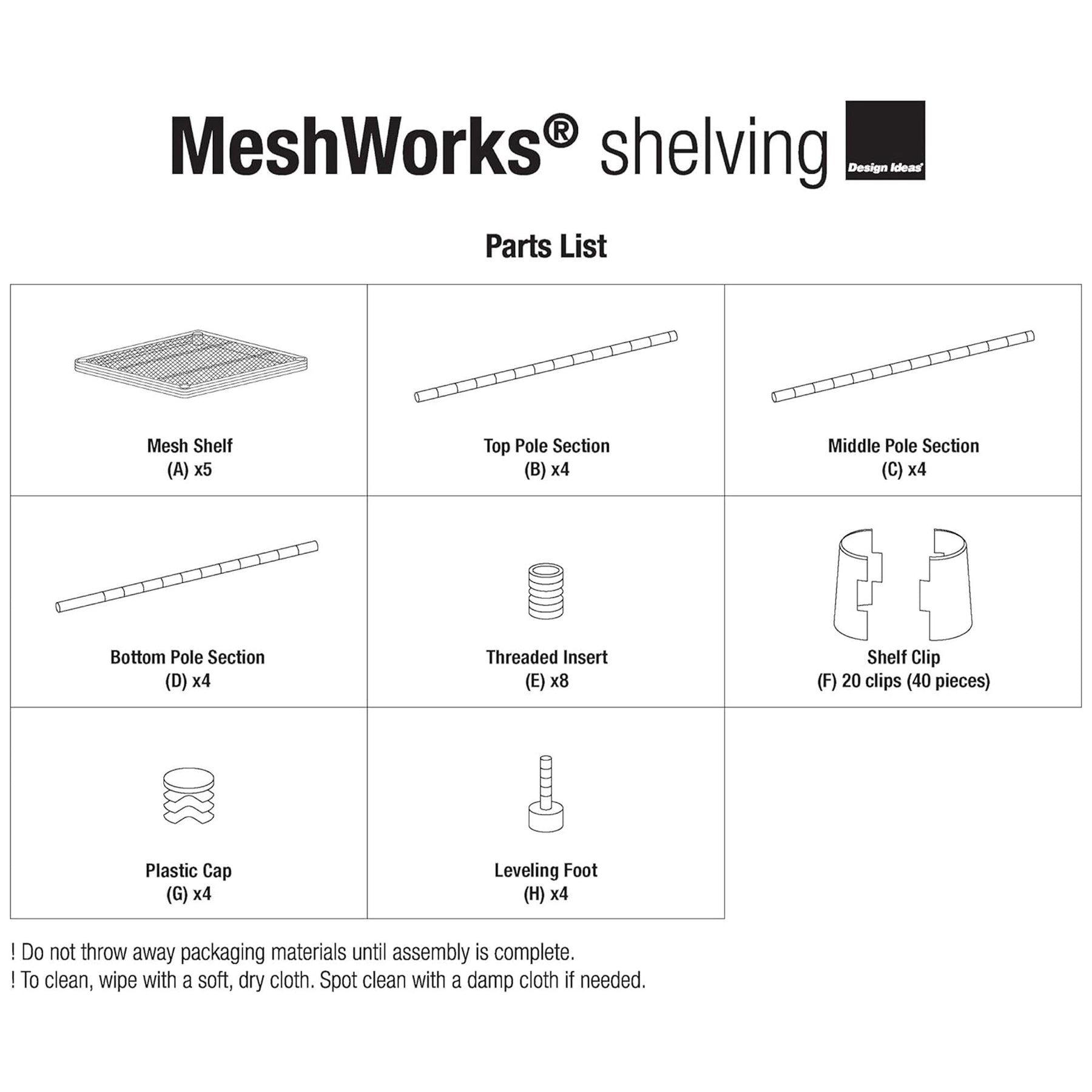 • Easy to assemble with no tools required and comes with 8 poles, 4 pole connectors, 4 leveling feet, 5 shelves 20 sets of locking clips, and assembly instructions
