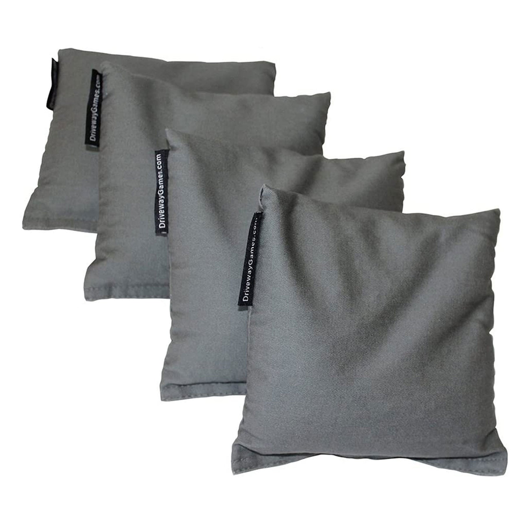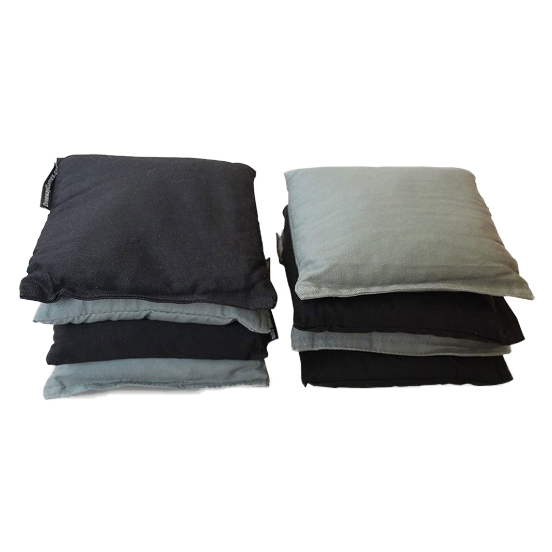 • Black and gray cornhole bags filled with eco-friendly, recycled moisture and pest-proof plastic pellets