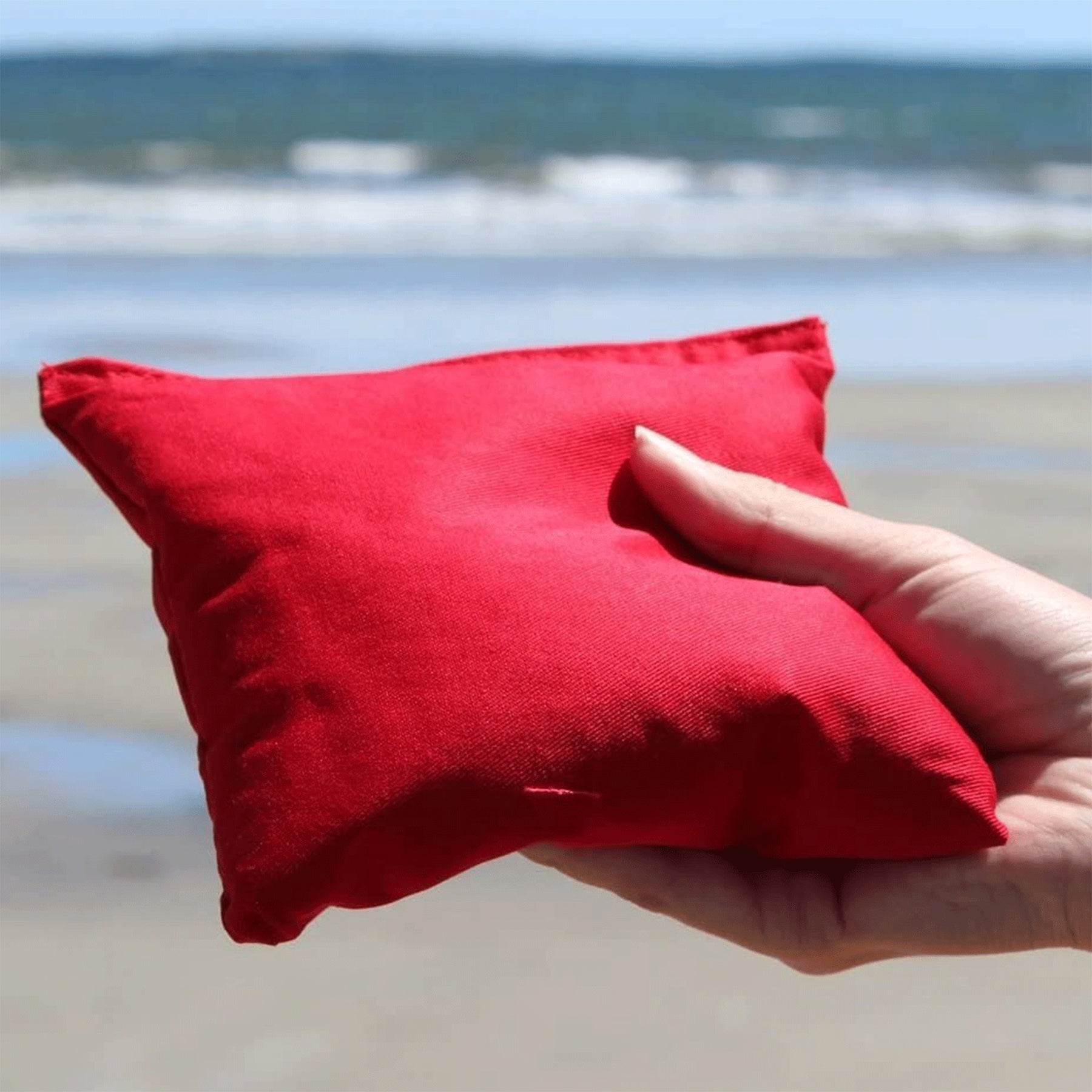 • Red and blue cornhole bags filled with recycled moisture and pest-proof plastic pellets