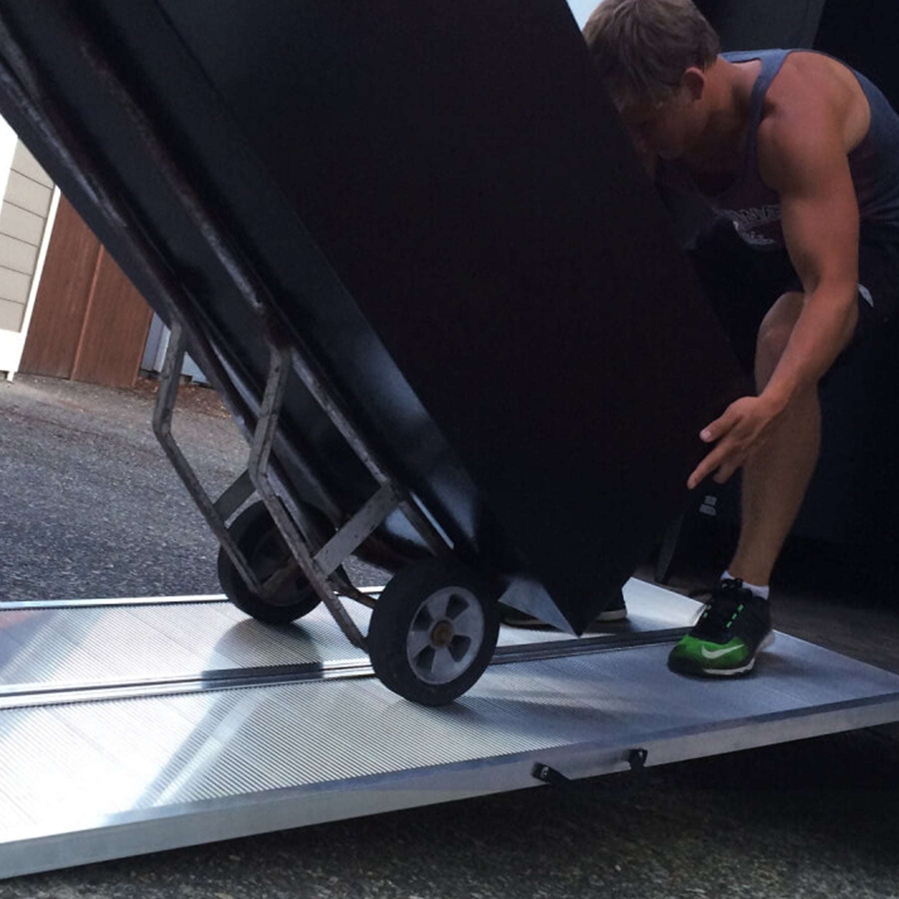 - Easily foldable to a compact 15.48-inch width and can be conveniently stowed in a truck, trailer, shed, or van; Durable handles provide a comfortable grip for easy carrying without compromising the ramp's functionality