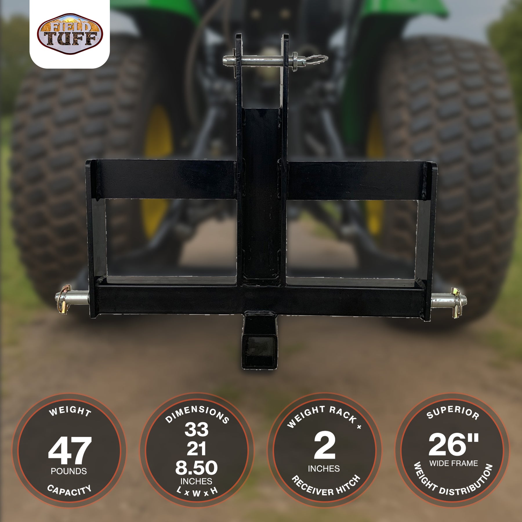 This hitch measures 26 inches wide and features two 10.75-inch weight bars that hold suitcase weights securely on each side. The integrated 2-inch receiver accepts standard ball mounts, giving you the flexibility to move trailers or tow equipment with ease. Designed for balance and durability, it creates even weight distribution to prevent strain and improve traction on your tractor.
