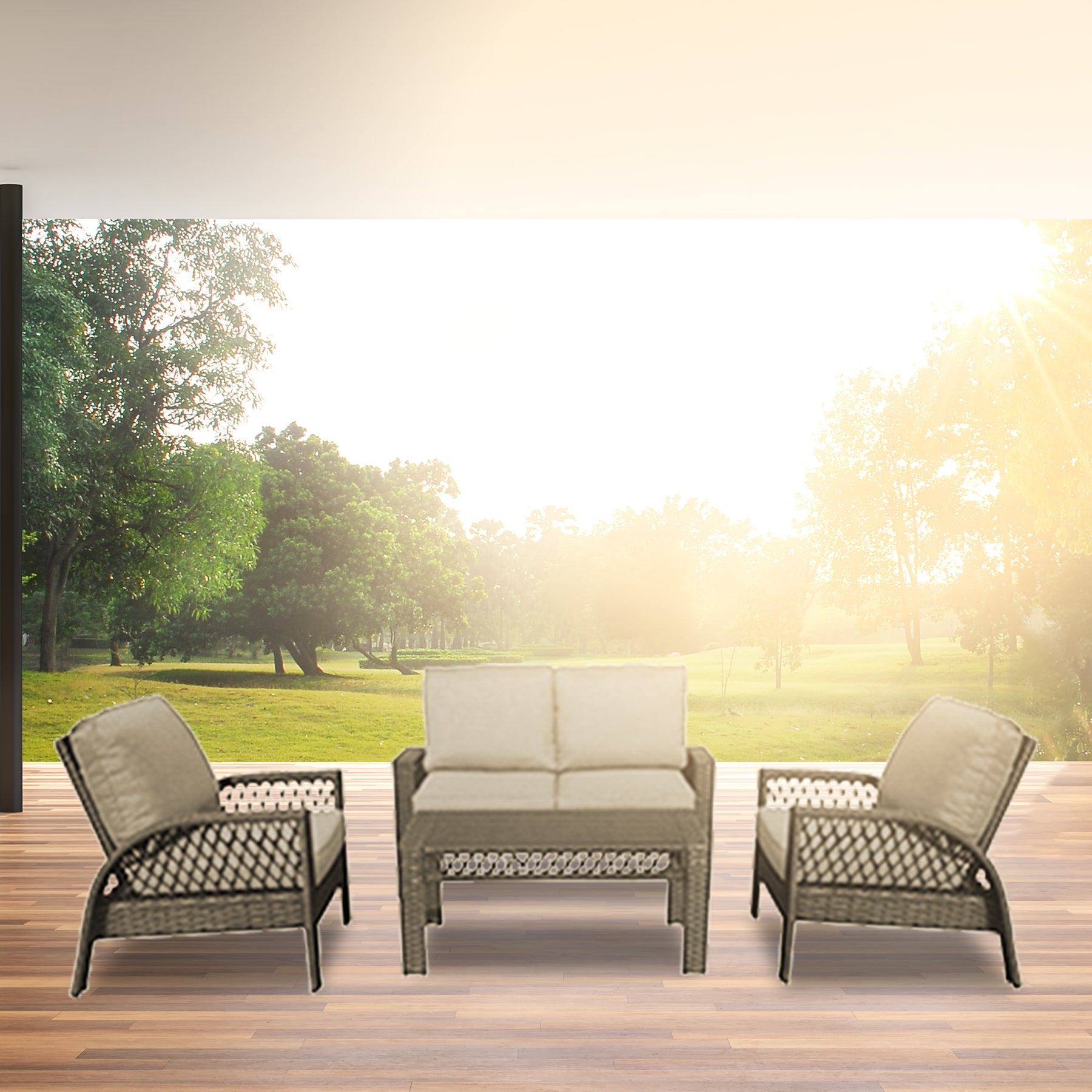 Transform your outdoor space into a haven of relaxation and style with the Four Seasons Courtyard Coral Bay 4-Piece Deep Seating Set. Crafted with meticulous attention to detail, this woven deep seating ensemble combines sophistication and durability. Embrace the luxury of all-weather wicker that effortlessly withstands the elements, ensuring your outdoor retreat remains chic and inviting year-round.
