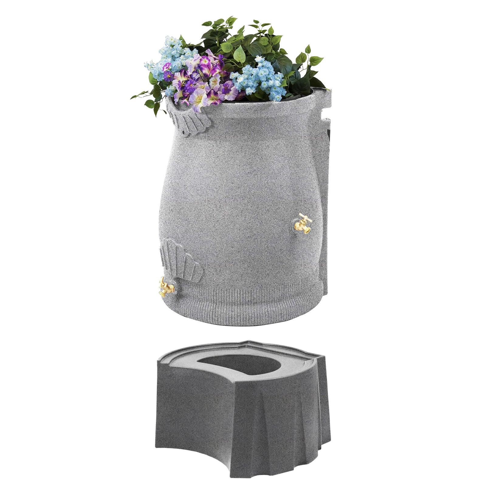 - Dark granite finish adds curb appeal to raised rain barrels with a flat-back profile that fits neatly against walls or fences