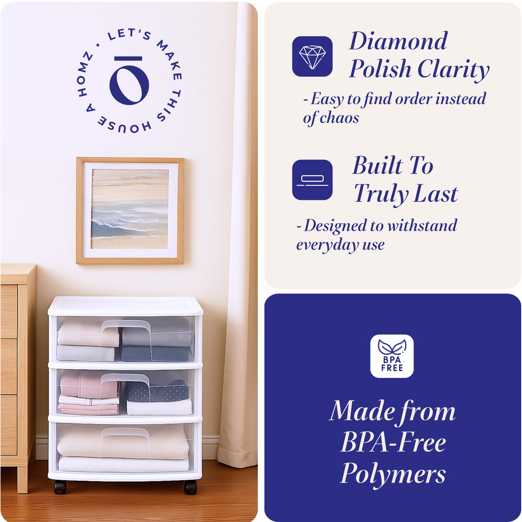 Homz 3 Clear Drawer Small Rolling Storage Container Tower, White Frame (Used)