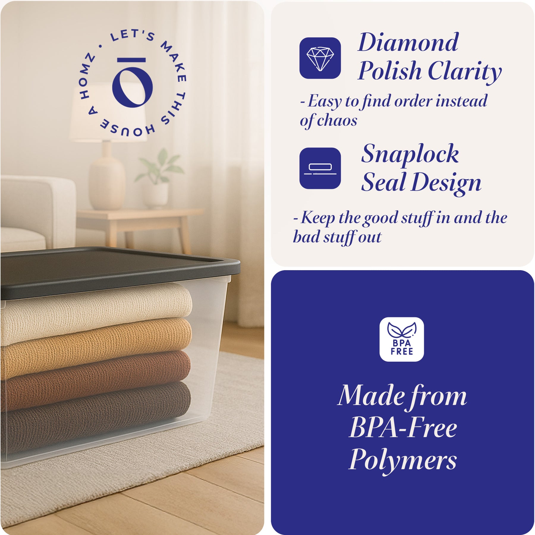 This clear storage bin with lid offers 56 quarts of internal space providing ample room for small to large items. Featuring secure snaplock lids, these storage containers offer a robust safeguard, guaranteeing the confinement of your personal items in a dry and secure environment, effectively shielding them from dust and debris. The clear design makes these containers even better. You can easily see what's inside without opening them, which saves time looking for things. This feature also helps you find items quickly and keeps your storage organized.
