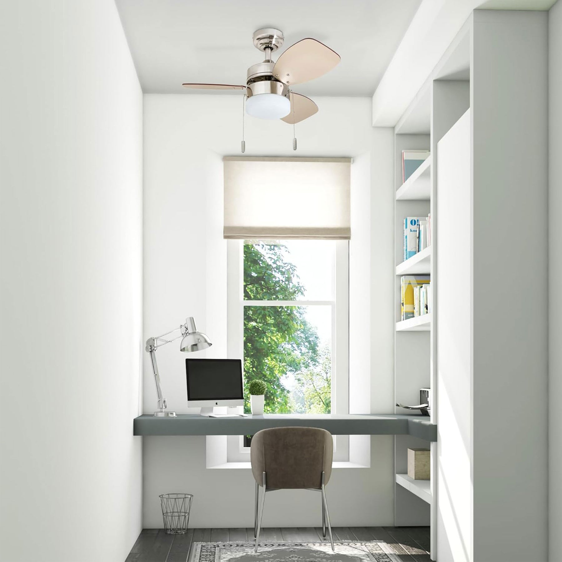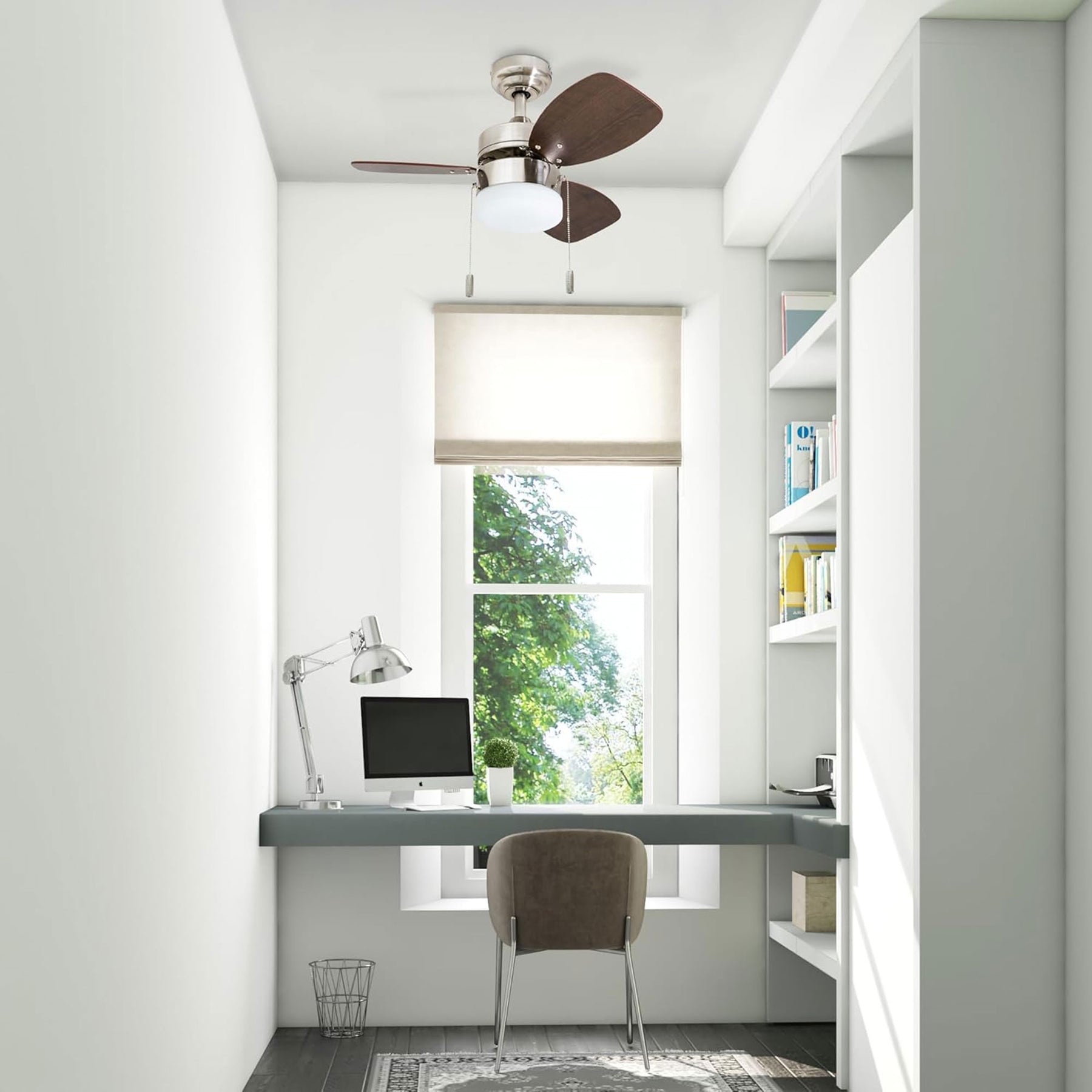 • 30-inch modern ceiling fan designed for small indoor spaces up to 100 square feet for efficient airflow and contemporary style