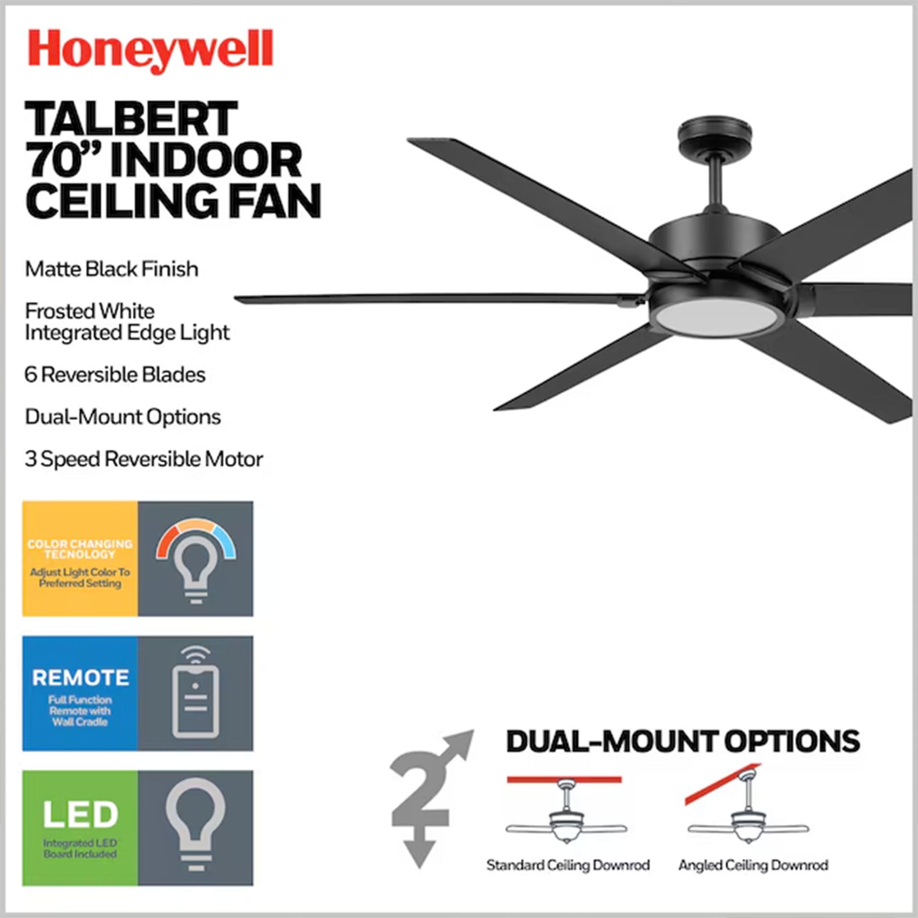 Honeywell Talbert Ceiling Fan, Color Changing LED and Remote, 70", Matte Black