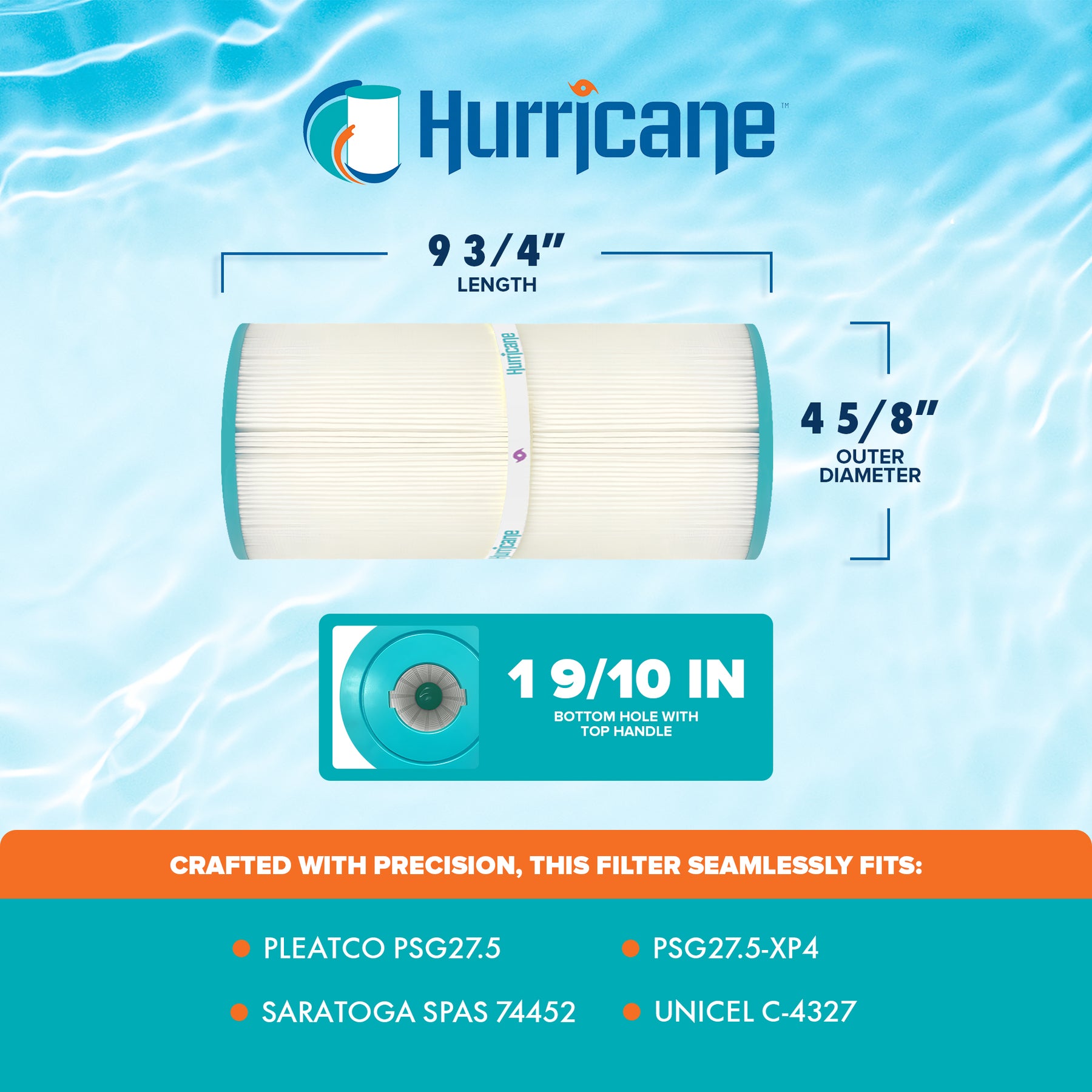 Dive into pristine waters with the Hurricane HF-PSG275-01 Advanced Cartridge Filter, where unparalleled cleanliness awaits. Crafted with meticulous precision, this filter guarantees seamless compatibility with compatible for Pleatco PSG27.5, PSG27.5-XP4, Unicel C-4327, Saratoga Spas 74452 and other compatible models. With dimensions measuring 9.75 inches in length, an outer diameter of 4.625 inches, top handle and bottom keyed hole of 1.9 inches, achieving an ideal fit with this filter cartridge is effortless; measure your current filter for a flawless match.