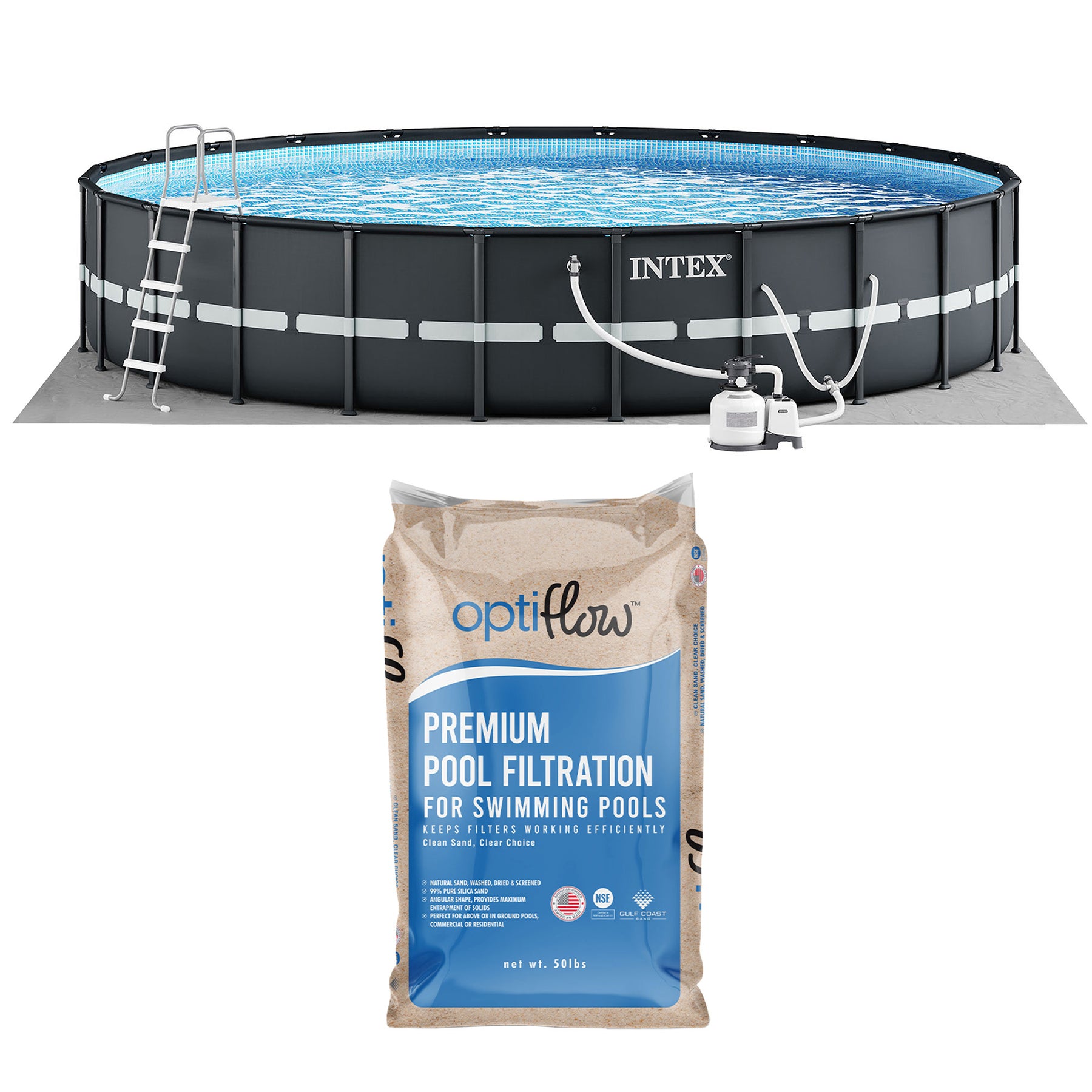 - Bundle includes an Ultra XTR 18-foot by 52-inch Pool Set with a 50-pound bag of Premium Pool Filter Sand from OptiFlow