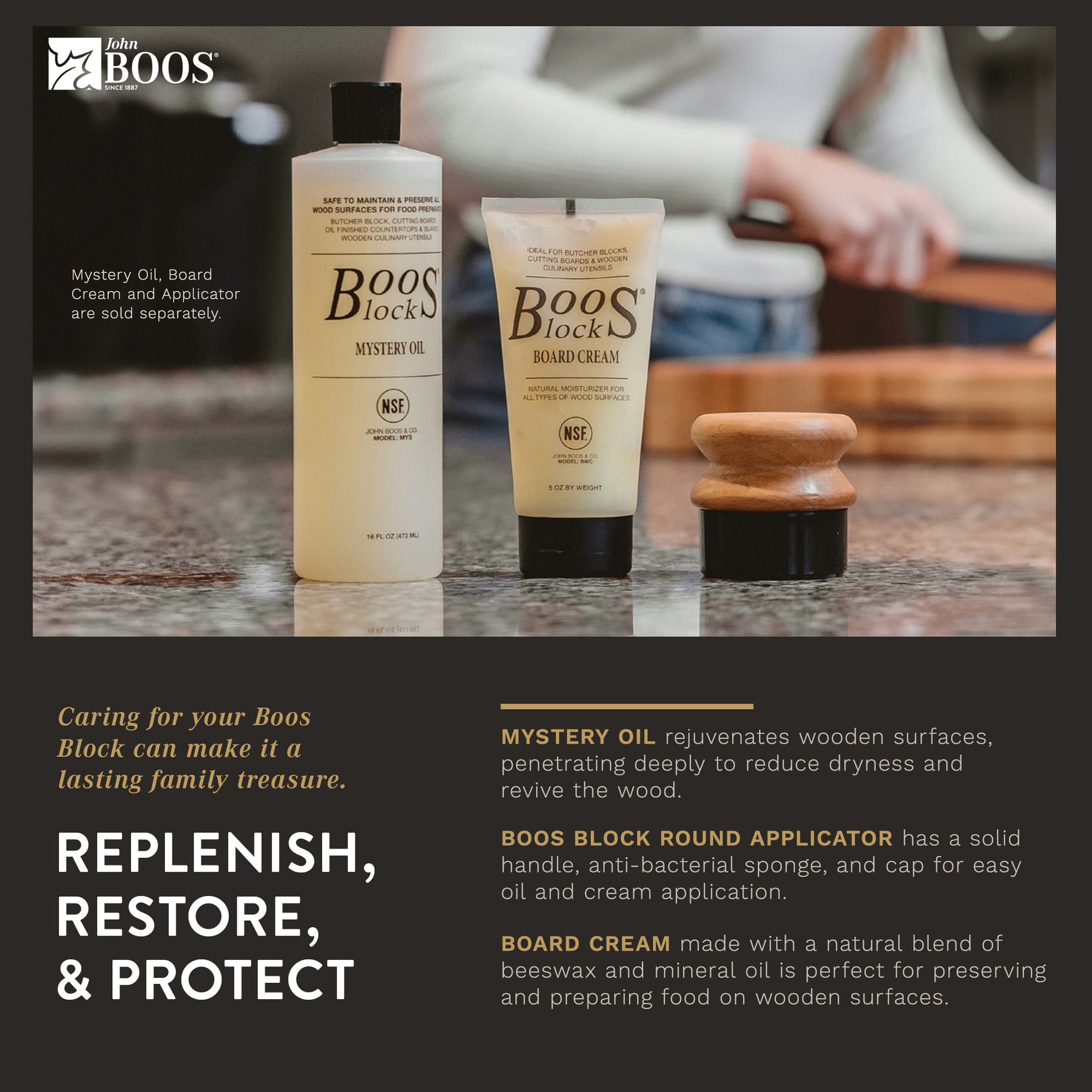 This expertly crafted tool features an oil finish that enhances the natural beauty of the wood board while offering added protection against moisture and daily wear. Maintain the bevel, sand minor scratches, and follow simple maintenance solutions found in our kitchen cutting board care and usage sheet to ensure longevity and optimal performance. For additional care, we recommend using our Boos Block Mystery Oil and Board Cream (sold separately) to revitalize and protect the wood fibers and wooden surface.
