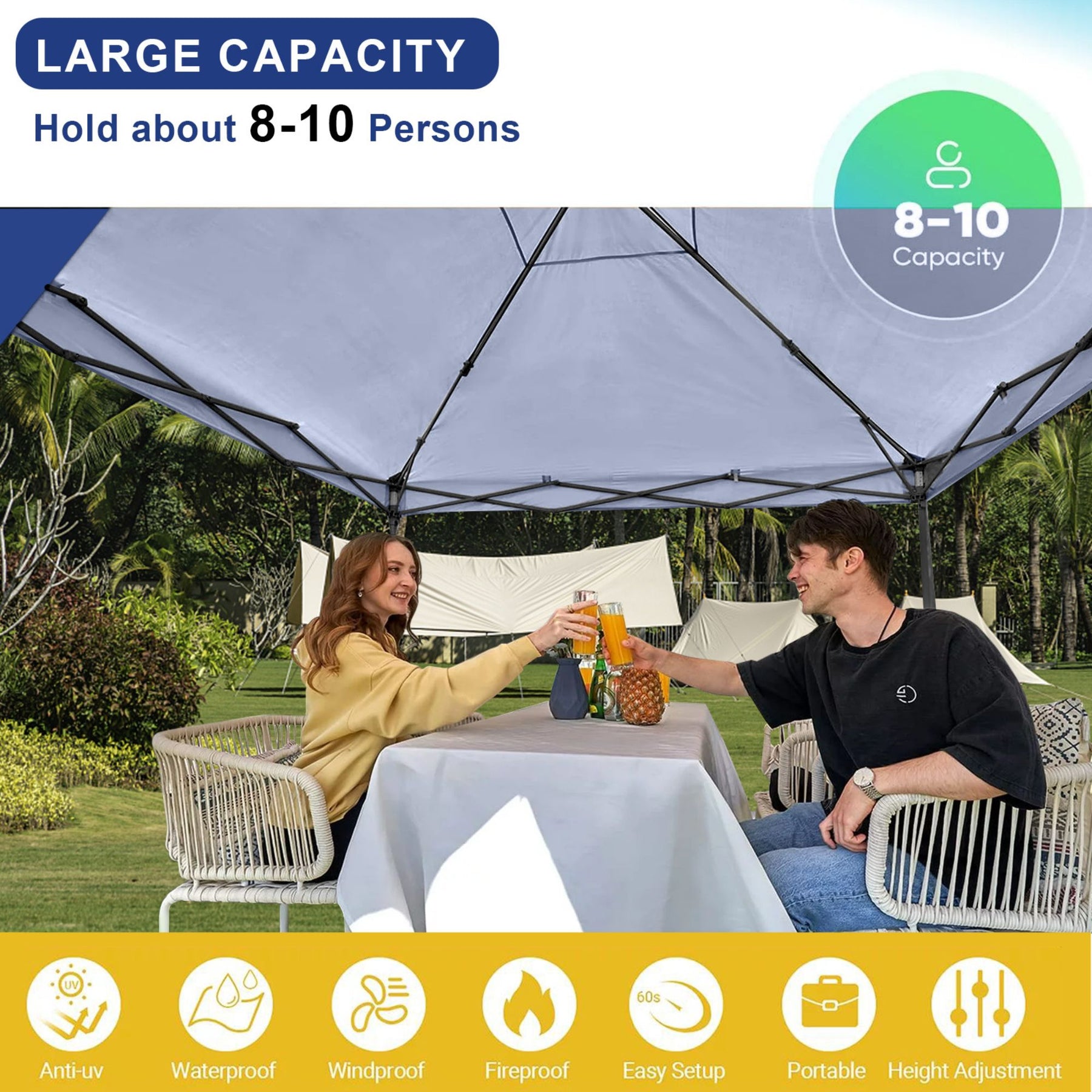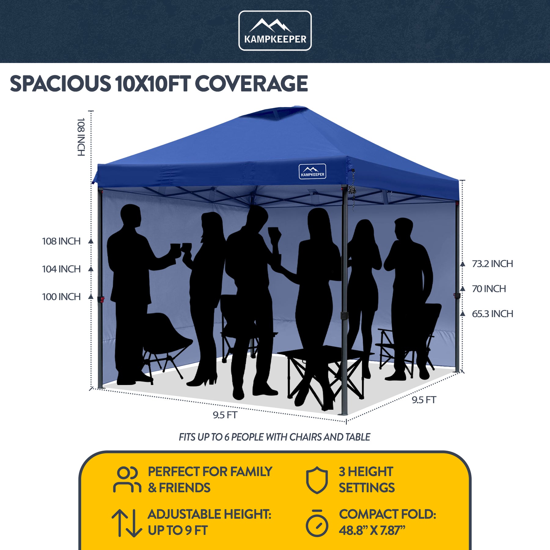 • 10 x 10 feet pop-up canopy tent provides 100 square feet of comfortable shade and can accommodate up to 10 seated people