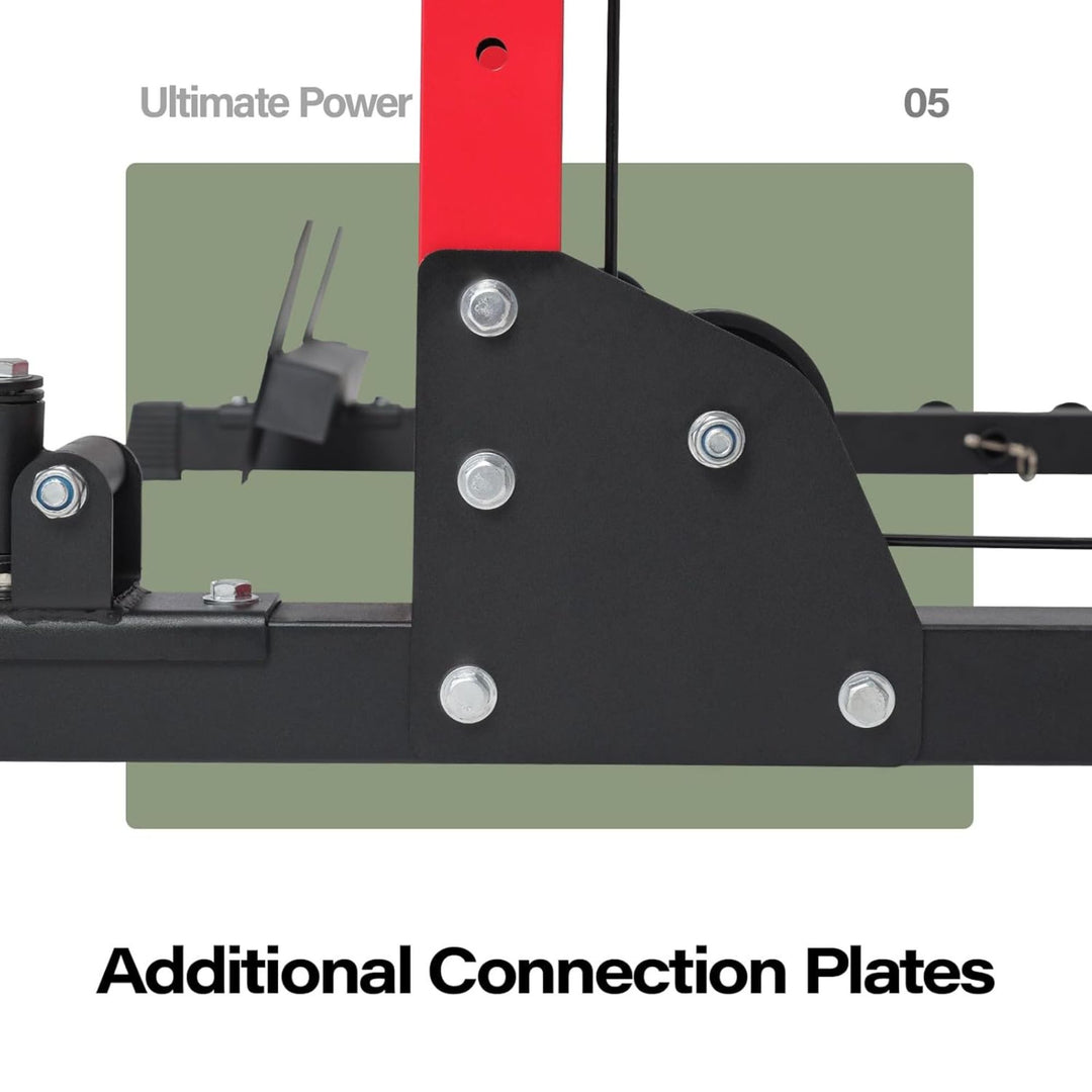For added safety, this rack includes reinforced safety bars (900 lbs capacity) and J-Hooks (1100 lbs capacity) to keep your workouts secure. It comes fully equipped with a lat pull-down bar, dip bars, cable handles, and safety accessories like wrist guards and power belts for a complete training setup.