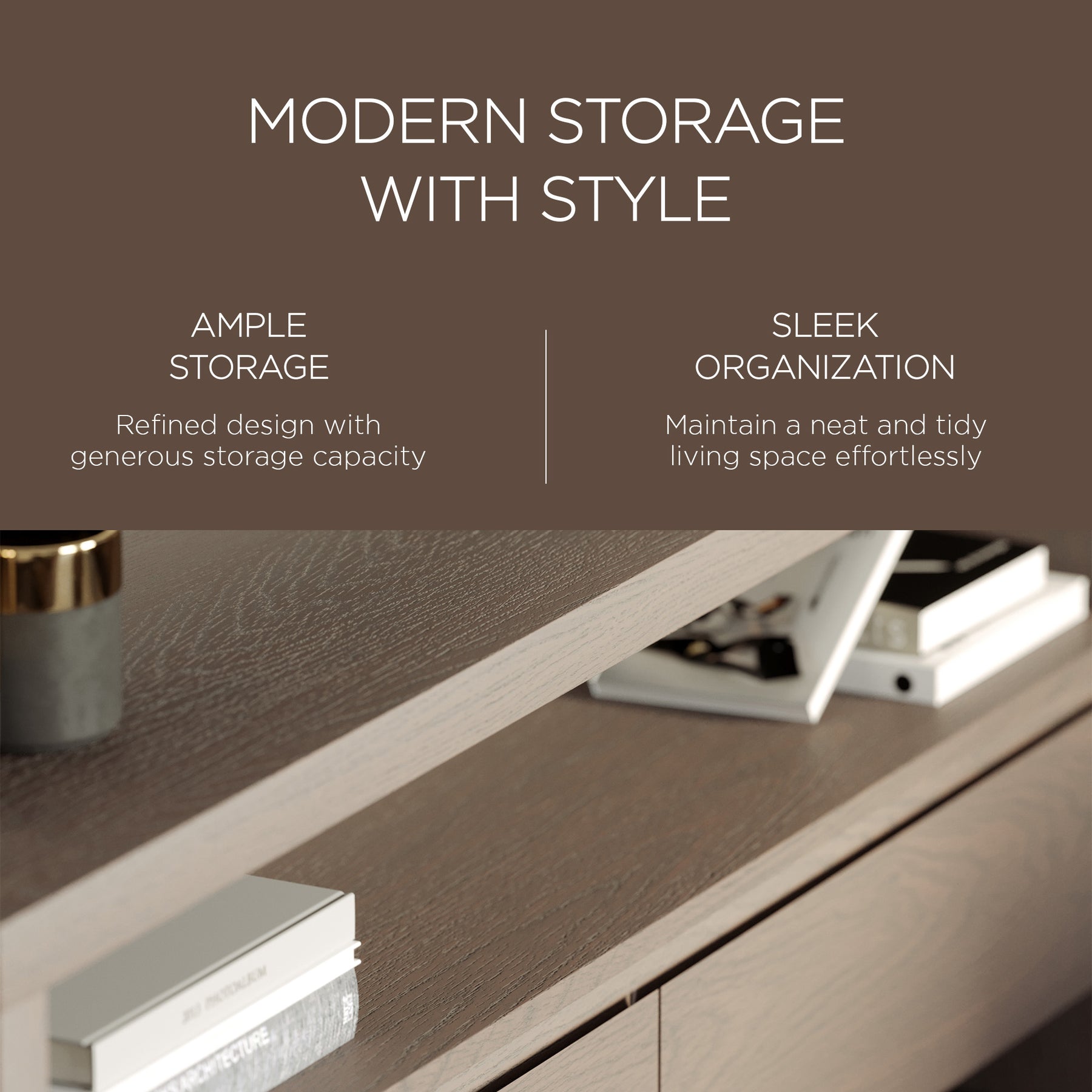 • Media console with abundant space to house entertainment needs with an open shelf, ideal for electronics for easy remote access, and 2 large drawers for stashing items