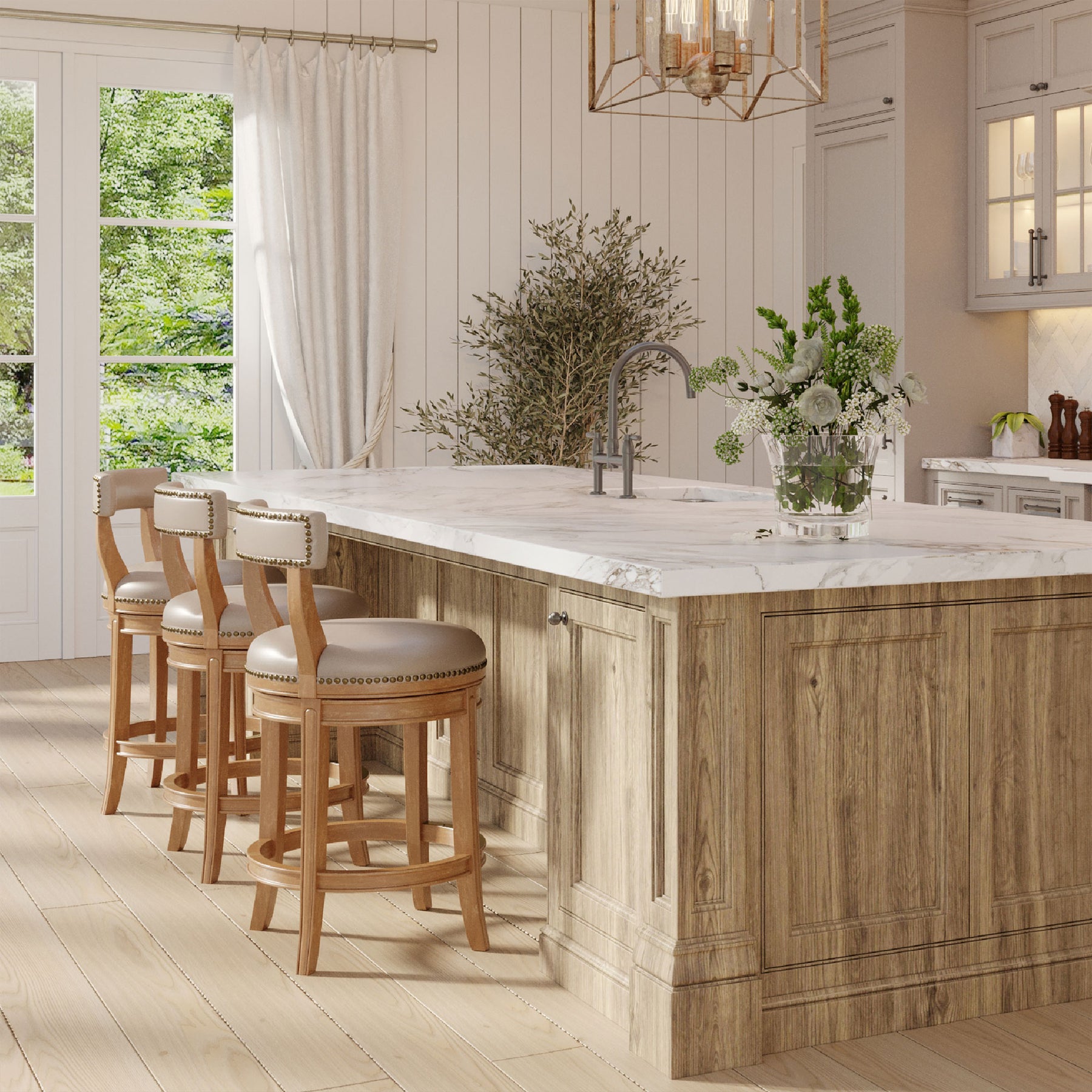 - Our Alexander Kitchen Stools with swivels are hand-crafted with impeccable attention to detail, from the nailhead trim to the wood-carved base