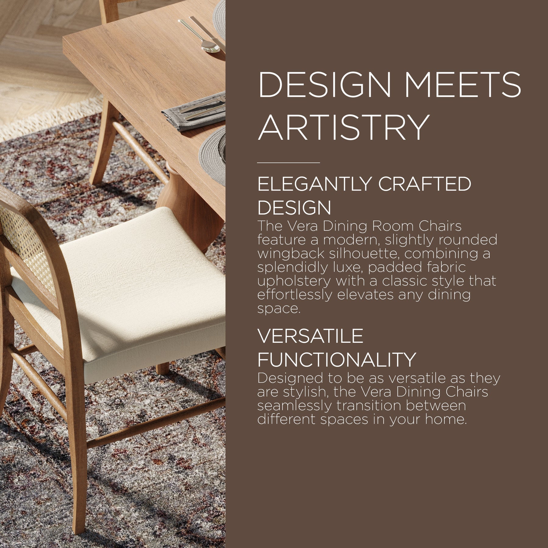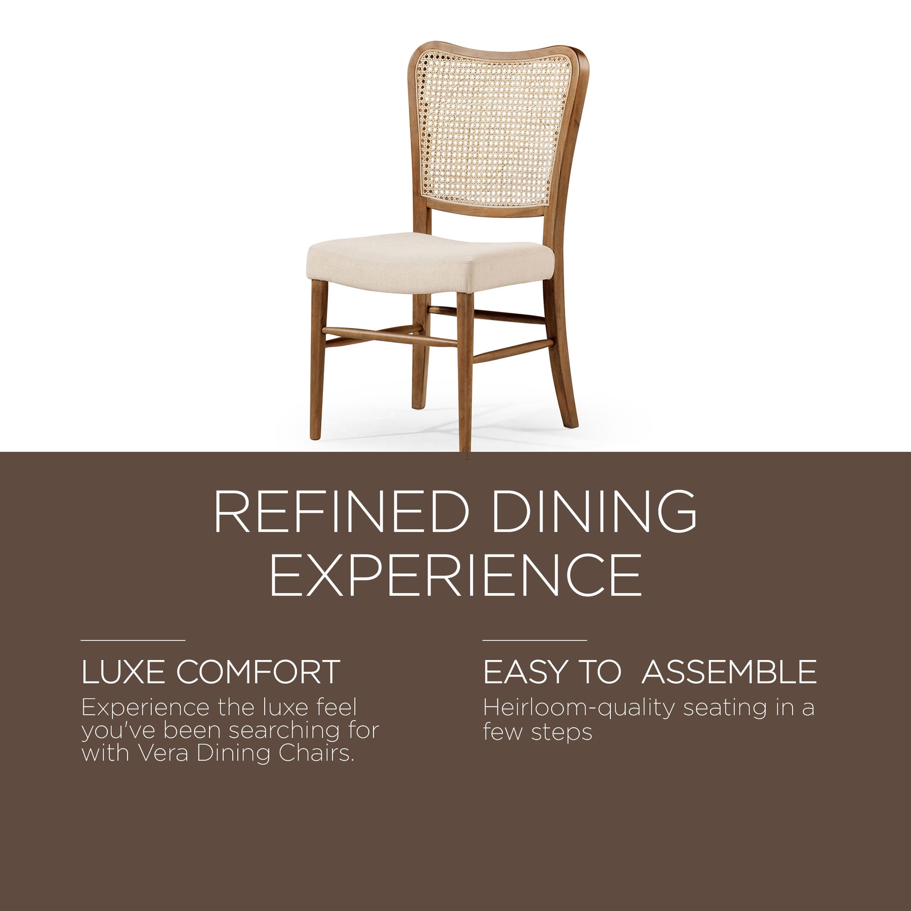 - Vera Dining Room Chairs offer organic vibes and neutral splendor to complete your dining room vision with a beautiful caned back, naturally finished wood frame, plush seating, and polished premium fabric upholstery