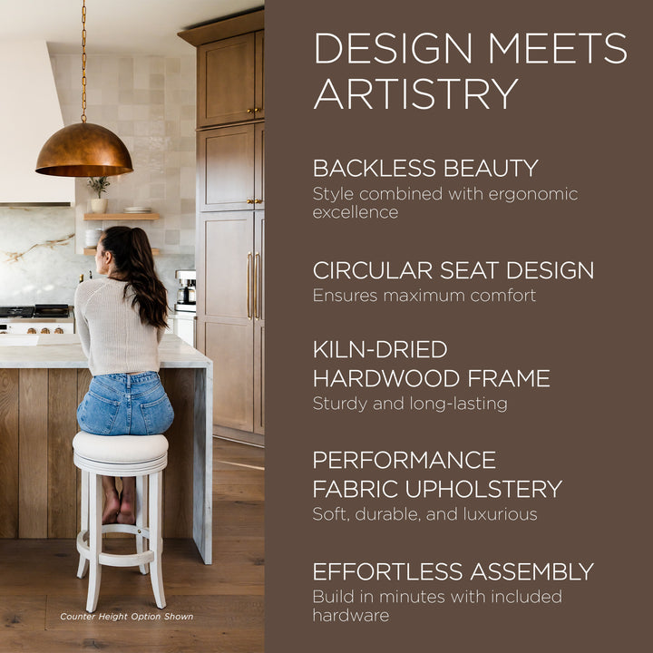 Sometimes simplicity is the best solution— this is certainly the case when it comes to designing our backless Eva Stool. A wide, round upholstered swivel seat is paired to perfection with a kiln-dried, solid wood frame and premium upholstery, and there you have it. The smooth rotating swivel seat allows our wooden barstools to remain stationary to support you as you pivot, while the 360-degree swivel allows you to entertain like a luminary. You’ll adore this barstool’s delicate details, like the fabric piping around the padded seat and the hand-carved striping that helps create styling cohesion. Beautifully at home tucked beneath your kitchen island countertop or in your breakfast nook, our swivel barstools are precisely what your pub or dining space has been pursuing whilst offering impeccable craftsmanship and meticulous extra attention to detail you’ll swoon over. We offer counter height and bar height stool options, so you can select the stool to fit your style and vision flawlessly. Please measure your space before ordering, as we recommend approximately 10" between the bottom of the counter surface and the top of the stool cushion when fully assembled for ideal comfort. Simple assembly is required for each stool, and the included tools and directions make setup a breeze. At Maven Lane, our well-made furniture is meticulously handcrafted with methods to stand the test of time, including hand finishes displaying impeccable attention to every single detail and sturdy mortise-and-tenon joinery, which promotes strength and longevity. By utilizing premium upholstery and kiln-dried natural hardwood in our solid wood furniture, we’ve solidified the superiority of craftsmanship you’ve come to expect from Maven Lane. We've carefully curated an entire medley of heirloom-quality pieces that can be mixed and matched to create the aesthetic your home has been seeking. Given the handmade nature of our products, minimal variations may occur in color, tone, and wood finish.