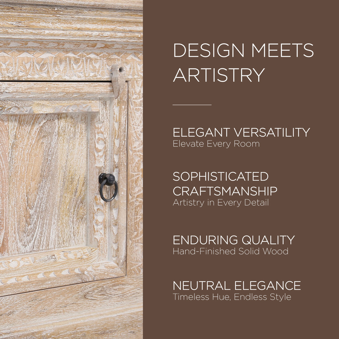 - Handmade media cabinet with hand-carved details and ample storage ensure this media console is a unique media solution