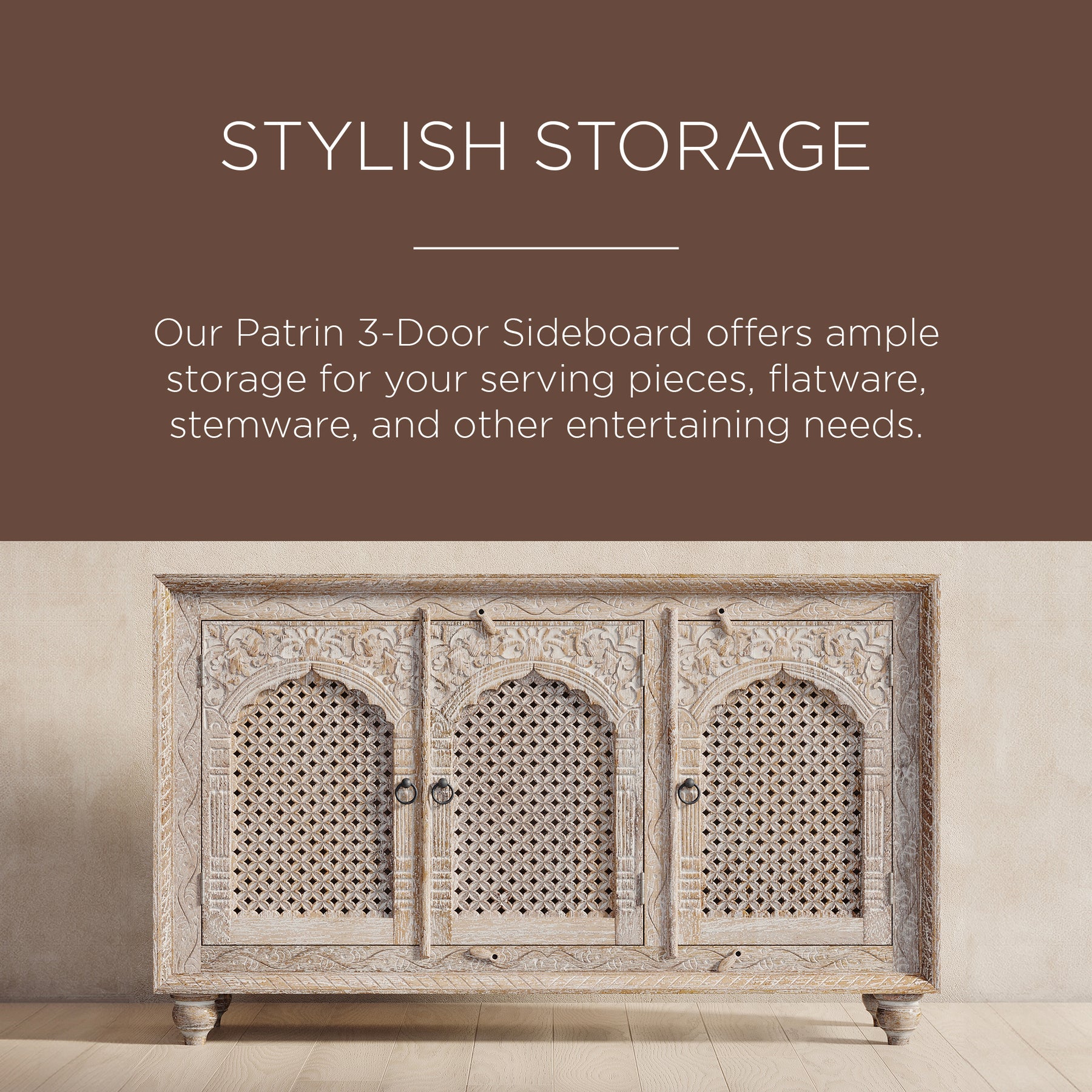 • Our Patrin 3-Door Sideboard offers ample storage for your serving pieces, flatware, stemware, and other entertaining needs