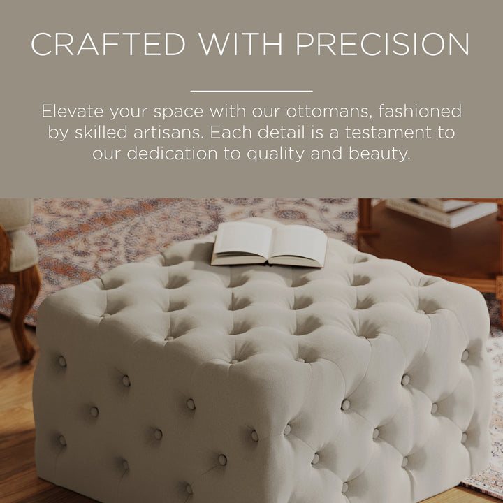 - Henry Upholstered Ottoman has a traditional aura with button-tufted detailing and premium fabric upholstery for a timeless, neutral look piece of furniture