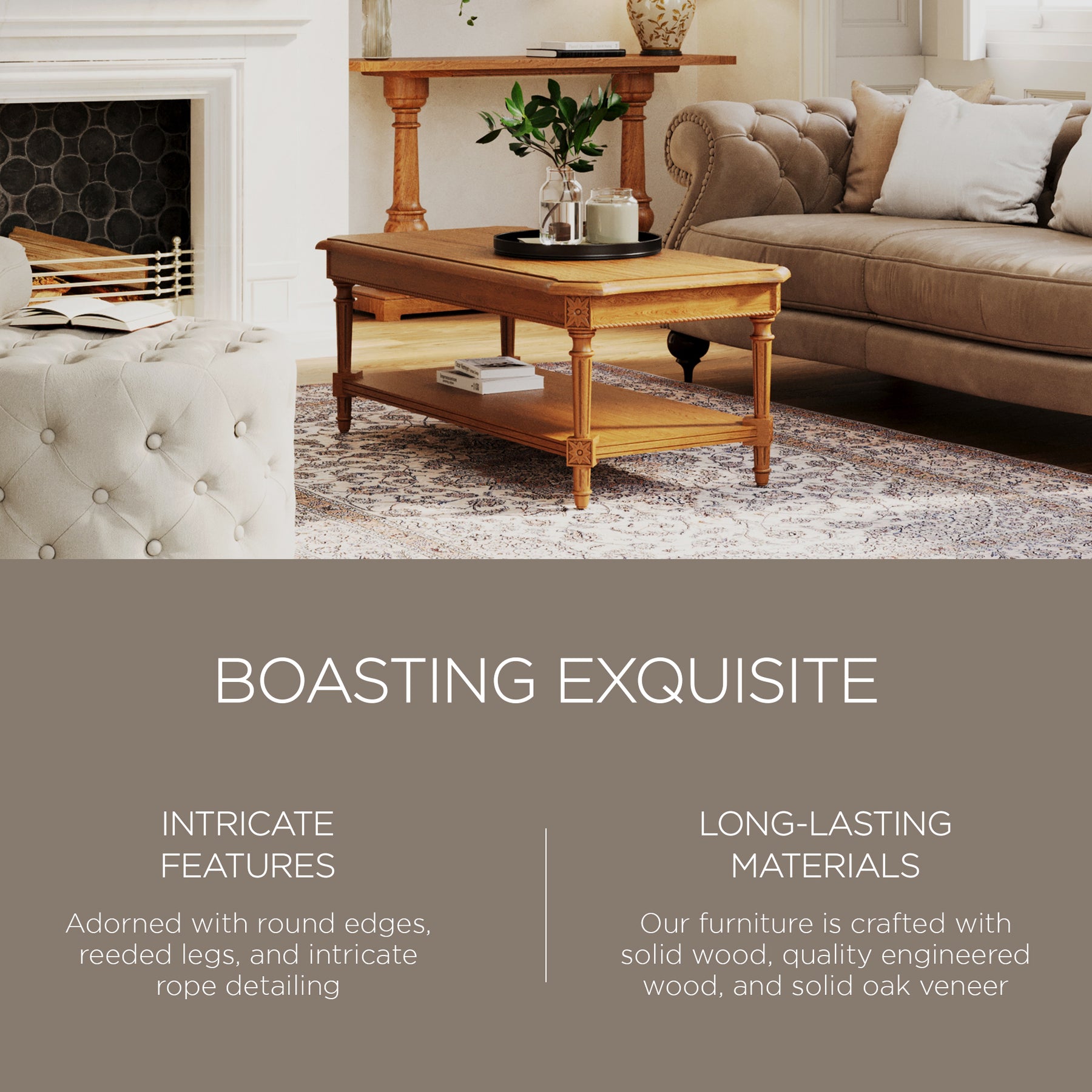 - Our hand-finished furniture is crafted with solid wood, engineered wood, and solid oak veneer, bringing timeless aesthetics with lifetime durability