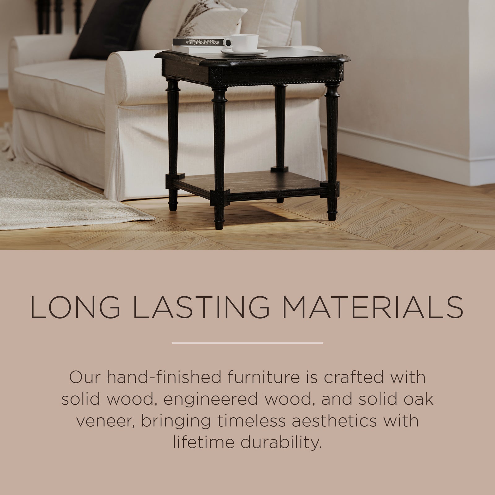 • Our hand-finished furniture is crafted with solid wood, engineered wood, and solid oak veneer, bringing timeless aesthetics with lifetime durability