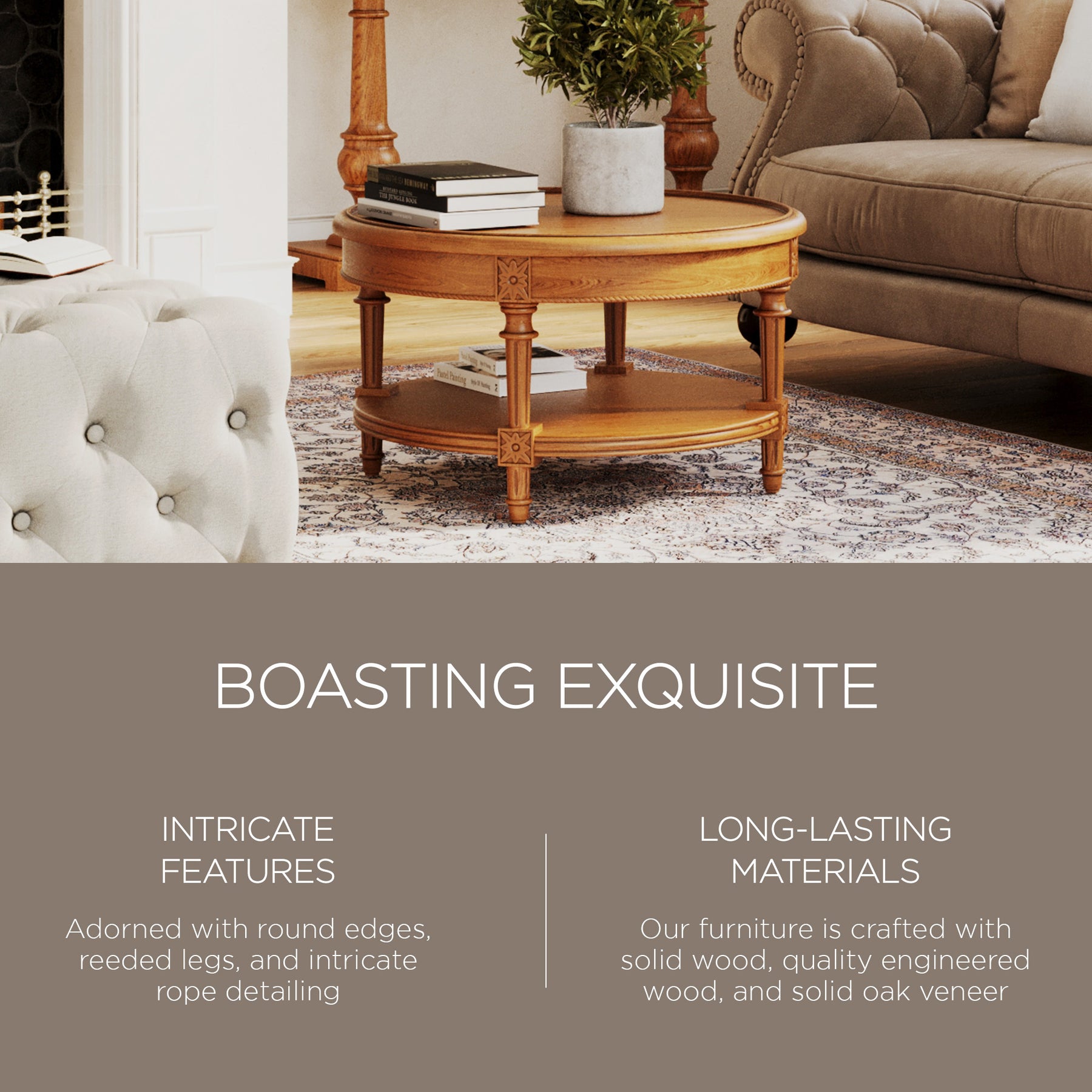 - Our Pullman round coffee table boasts exquisite, hand-carved details, including rounded table edges, reeded legs, and carved rope detailing