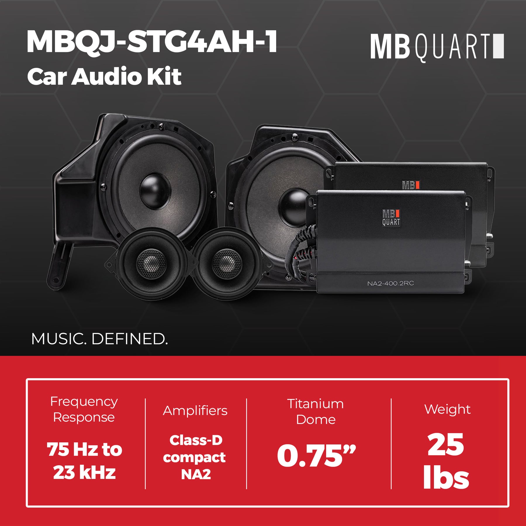 With a frequency response of 75 Hz–23 kHz, sensitivity of 89 dB, and a black finish that blends with Jeep interiors, this kit provides both performance and style. Dimensions measure 22.24 x 18.34 x 10.59 inches with a total weight of 25 pounds. Backed by MB Quart’s heritage of German engineering, the STAGE 4 Jeep upgrade kit delivers reliable power, premium sound quality, and long-lasting durability for your vehicle.