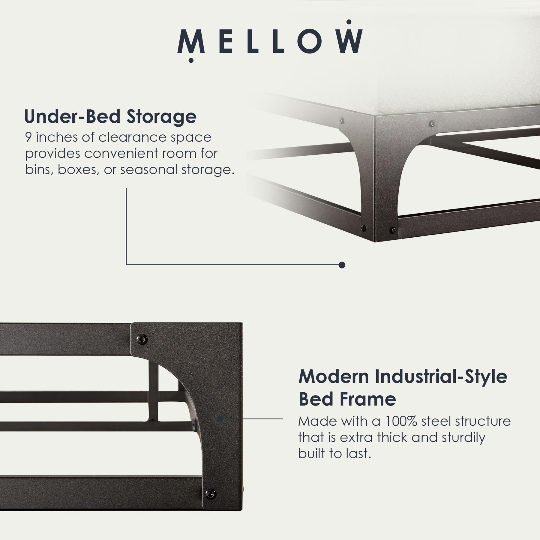 • Metal bed frame made with 100-percent steel structure is extra thick and built to last, with hinged corners for safety