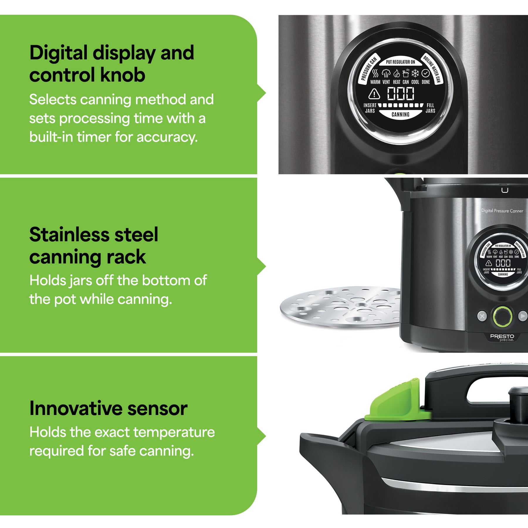 - Innovative sensor holds the exact temperature required for safe pressure canning, with no adjustments needed, even at high altitudes