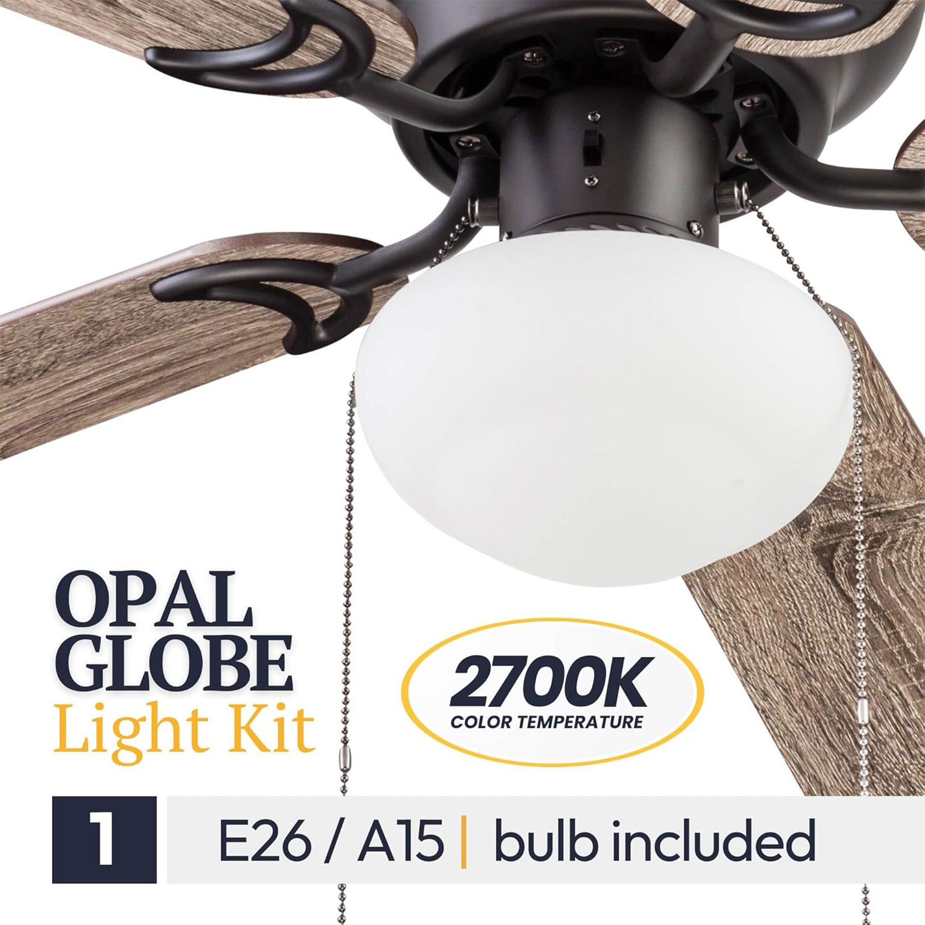 The opal glass globe light kit provides soft, warm illumination with an A15/E26 LED bulb (included) delivering 800 lumens at a 3000K color temperature. The light is fully dimmable from 100% to 20%, allowing you to set the perfect brightness for any setting. The five dual-finish reversible blades in Gray Pine and Maple Brown finishes make it easy to customize the look to complement your home’s décor.