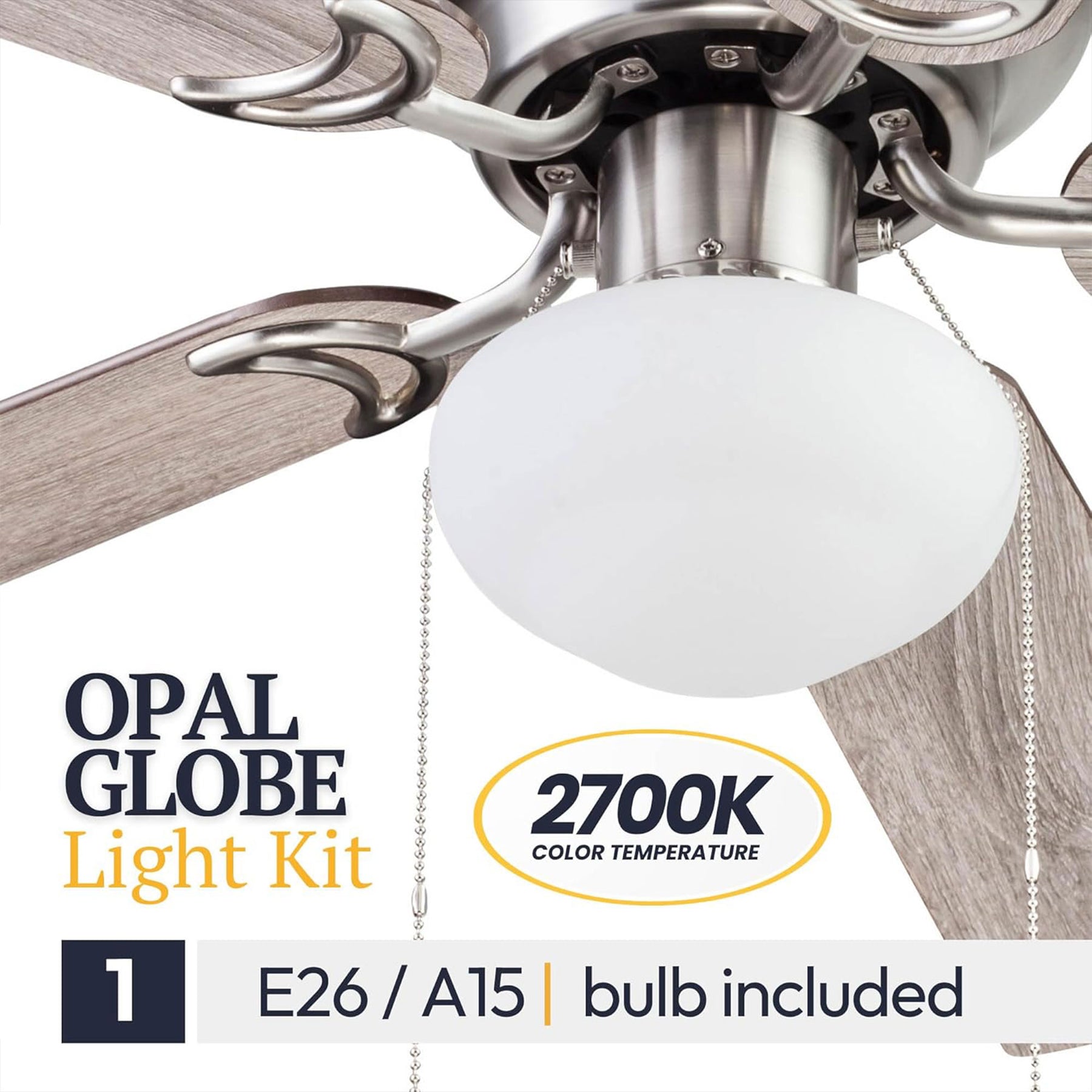The opal glass globe light kit provides soft, warm illumination with an A15/E26 LED bulb (included) delivering 800 lumens at a 3000K color temperature. The light is fully dimmable from 100% to 20%, allowing you to set the perfect brightness for any setting. The five dual-finish reversible blades in Gray Oak and Brown Walnut finishes make it easy to customize the look to complement your home’s décor.