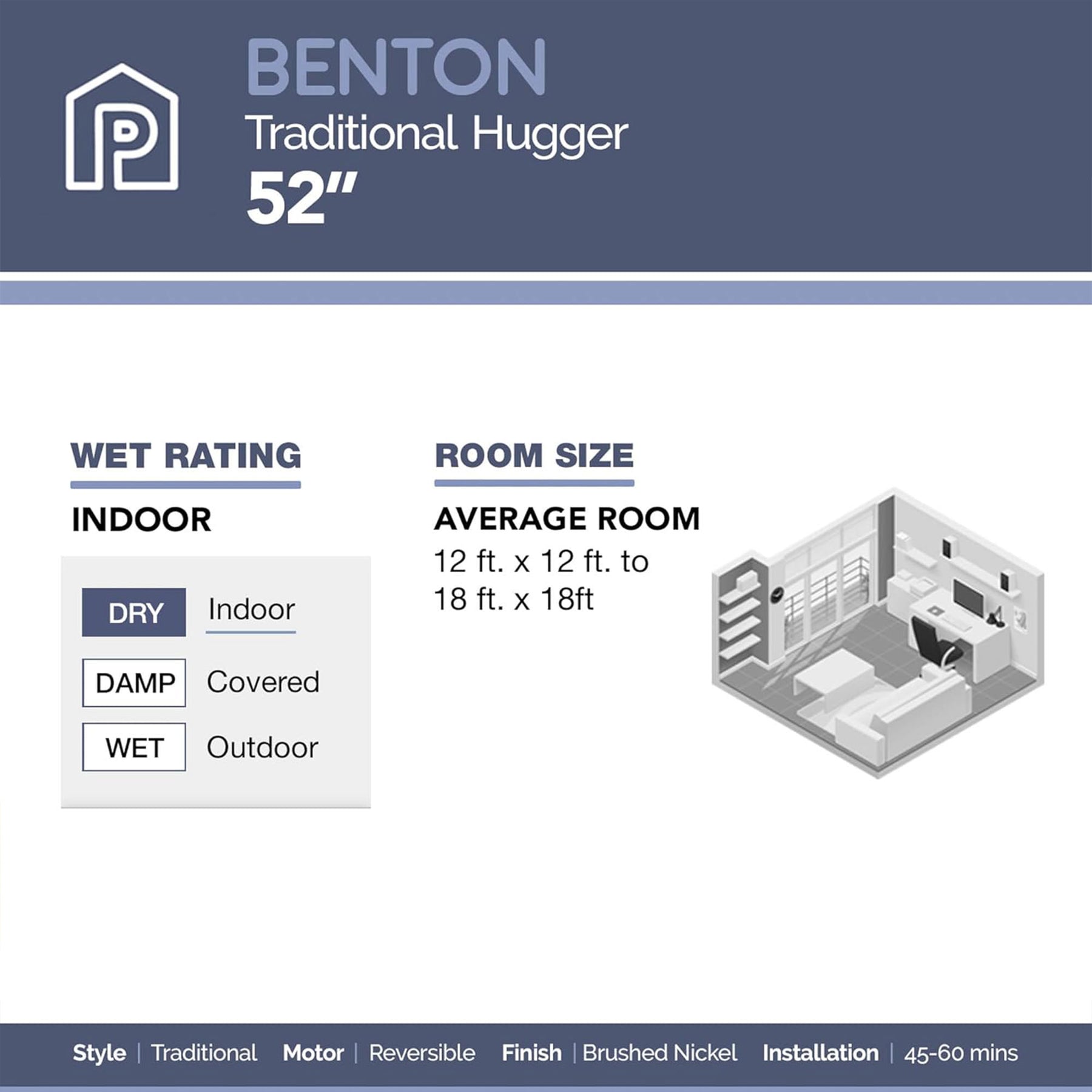 The Prominence Home Benton 52-Inch Traditional Indoor LED Ceiling Fan blends timeless design with reliable performance for year-round comfort. Ideal for medium to large rooms up to 400 square feet, this fan features a brushed nickel finish with classic accents, offering a sophisticated touch that complements any décor. Its flush mount, low-profile design makes it perfect for rooms with lower ceilings while still delivering powerful airflow.