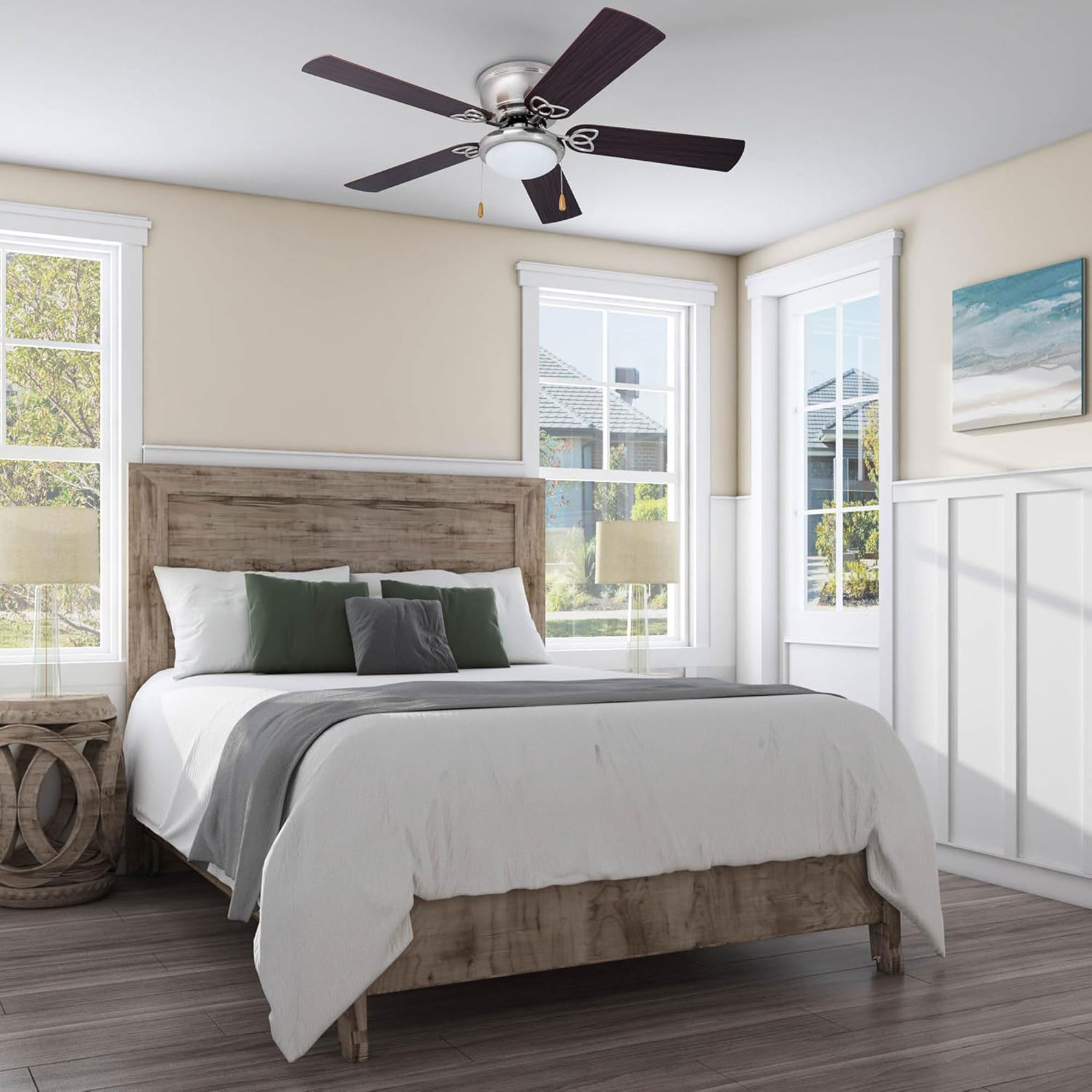 The quiet, reversible 3-speed motor ensures strong, efficient airflow in summer and reverses in winter to help distribute warm air, improving overall energy efficiency. Dual pull chain controls provide simple operation for fan speeds and lighting, while compatibility with most universal remotes (sold separately) adds convenience.
