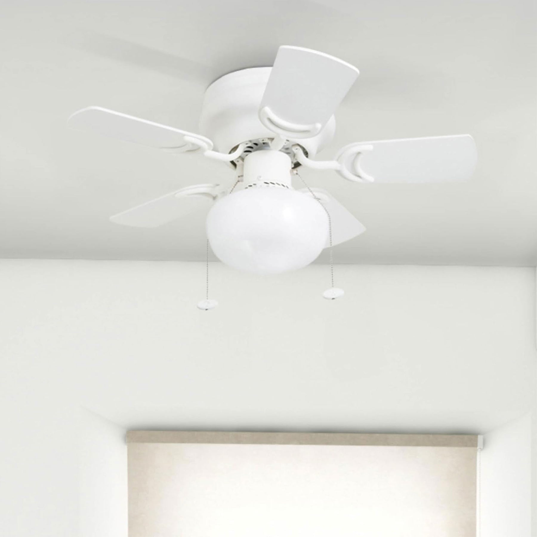This fan works seamlessly in smaller spaces where height is limited — the hugger-mount style ensures it hugs the ceiling, making it perfect for bedrooms, living rooms, and intimate indoor settings. The included schoolhouse-style globe LED light kit (E26/A15 LED bulb, 3000K, 800 lumens) provides a clean, bright glow that enhances your space without overpowering it.