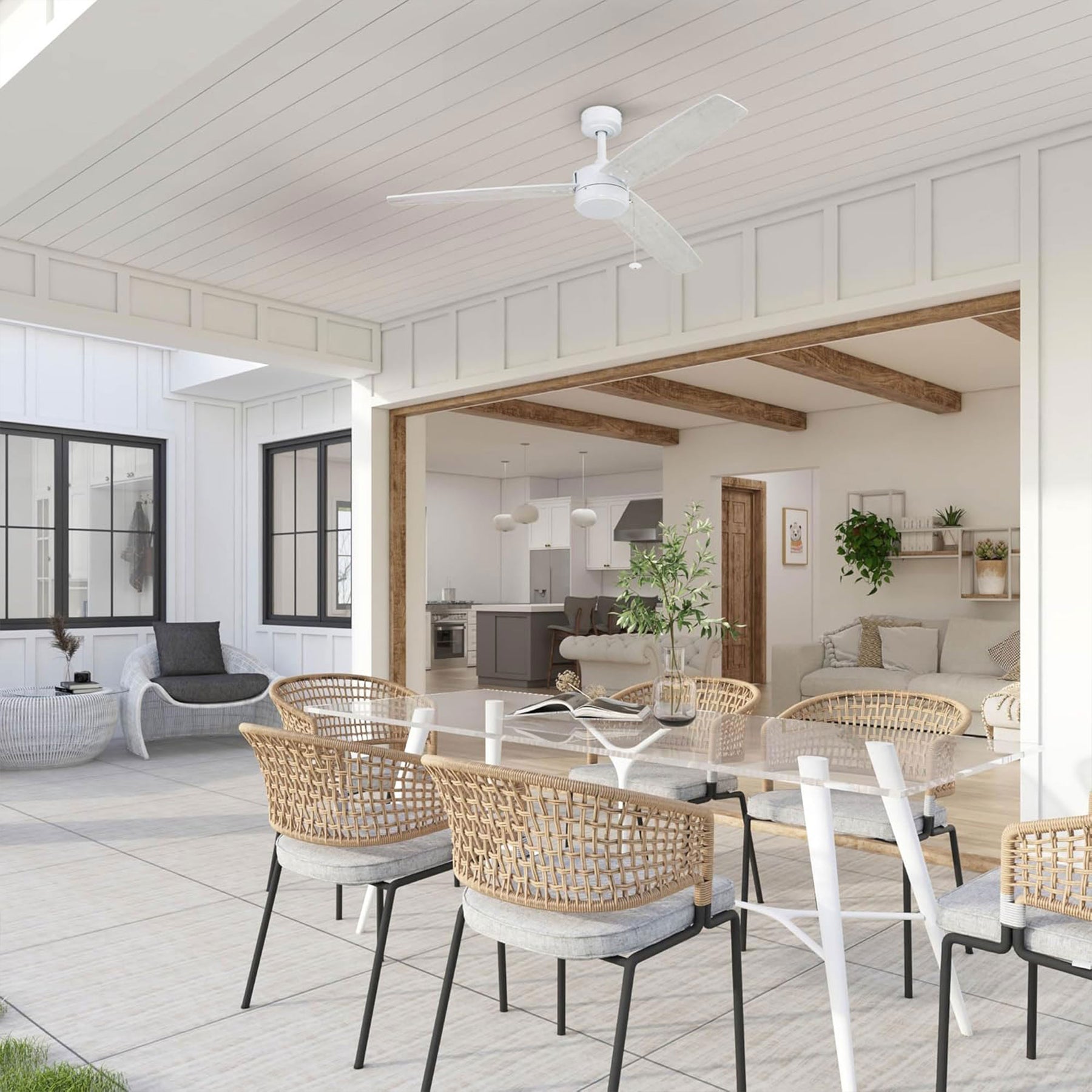 The dual-mount system offers flexibility for standard or angled ceilings. Whether you install it in a living room, kitchen, or covered patio, this durable fan is built for reliable performance in damp locations. The moisture-resistant materials ensure long-lasting function while maintaining a clean, low-profile look that complements modern spaces.