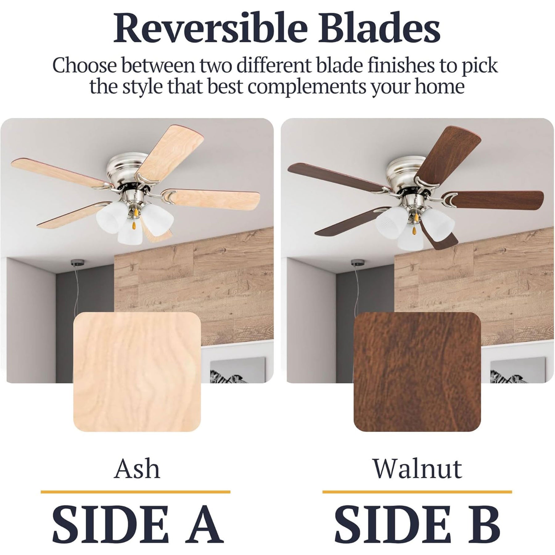 • 5 dual-finish reversible blades in Ash and Walnut; choose the finish that best fits your décor and update anytime