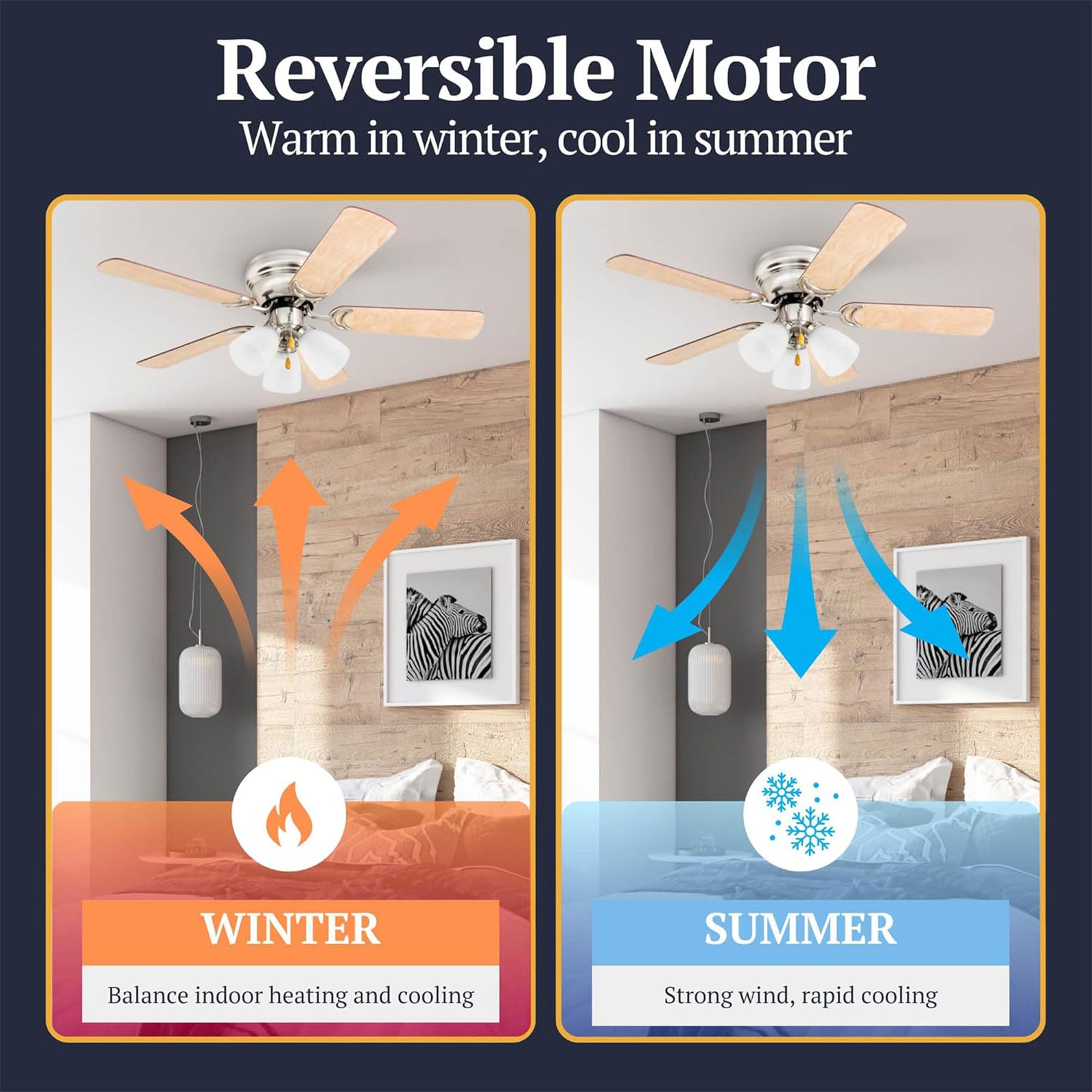 • Quiet, reversible motor provides strong airflow for cooling in summer and reverses in winter to distribute warm air evenly