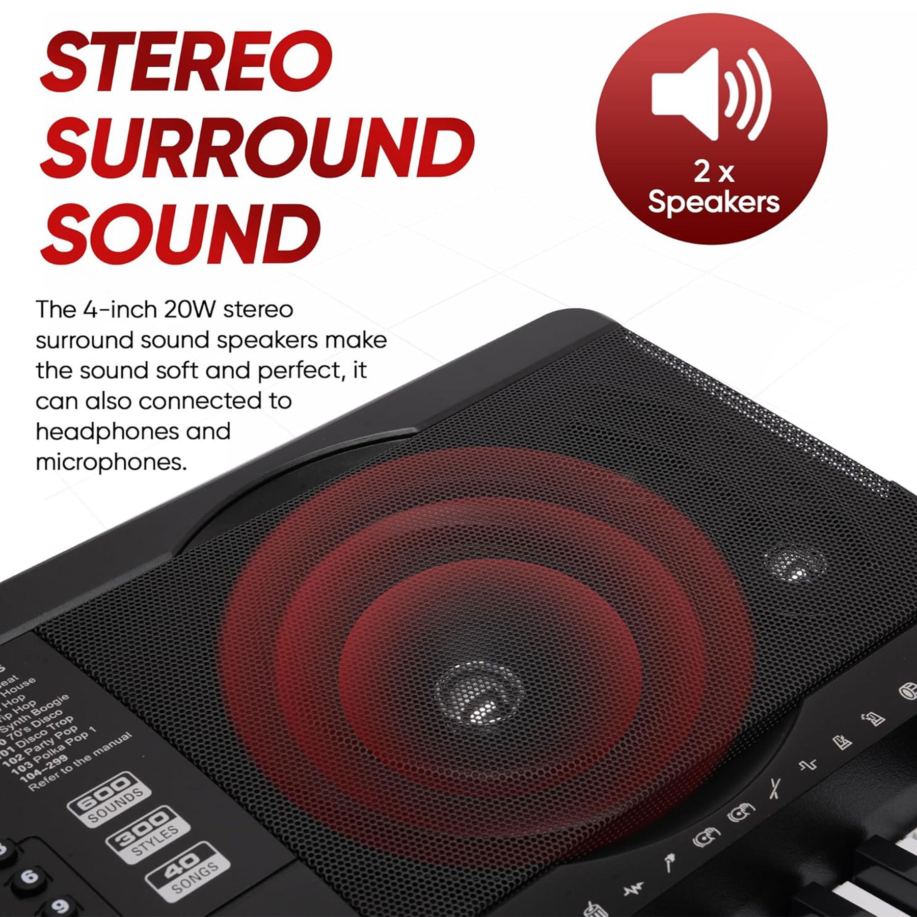 • Built-in full-range stereo speakers provide a rich and immersive audio experience that captivates both performers and listeners alike