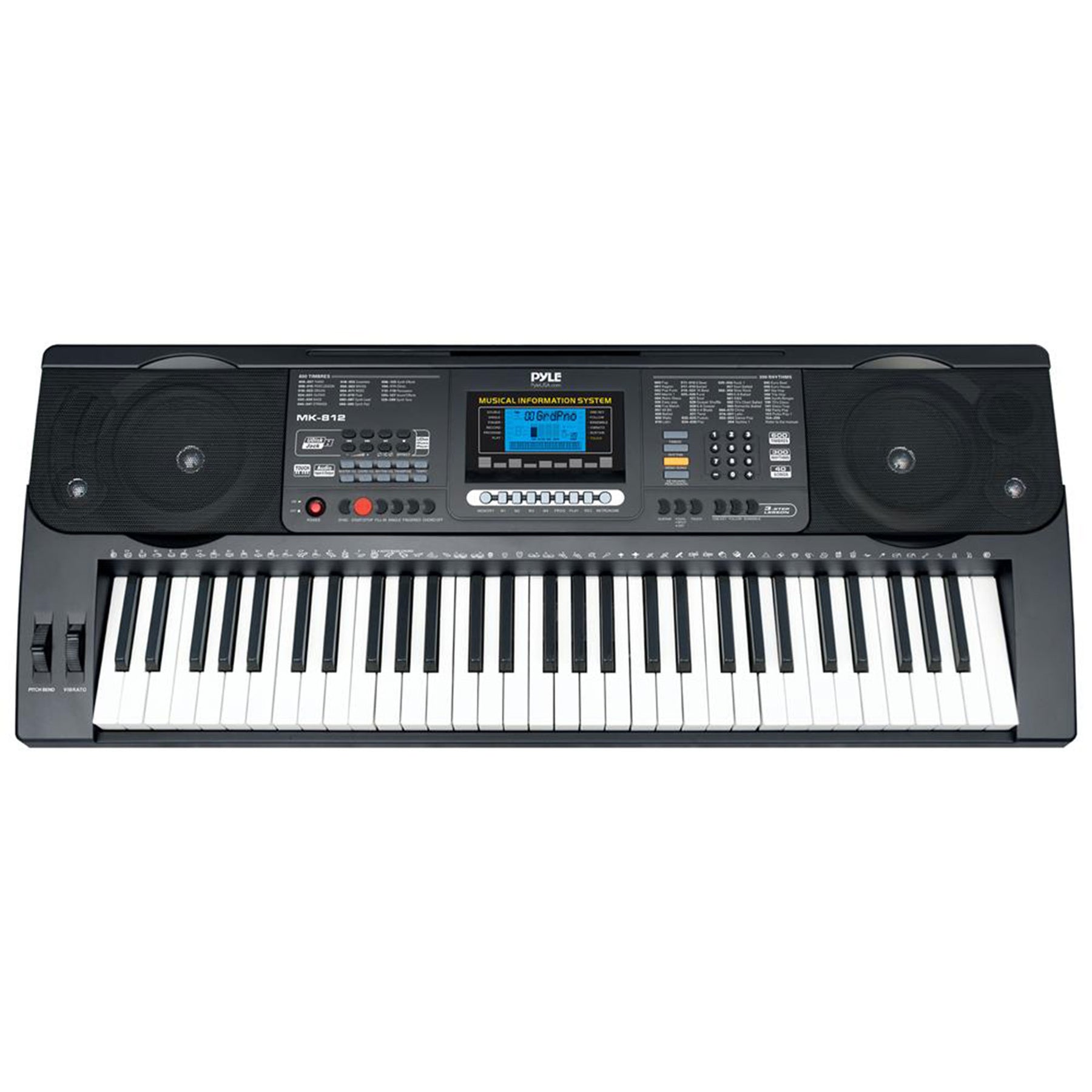 • Versatile keyboard with multiple preset selectable keyboard sounds, rhythm styles, and advanced features like pitch bend, vibrato, and touch sensing function
