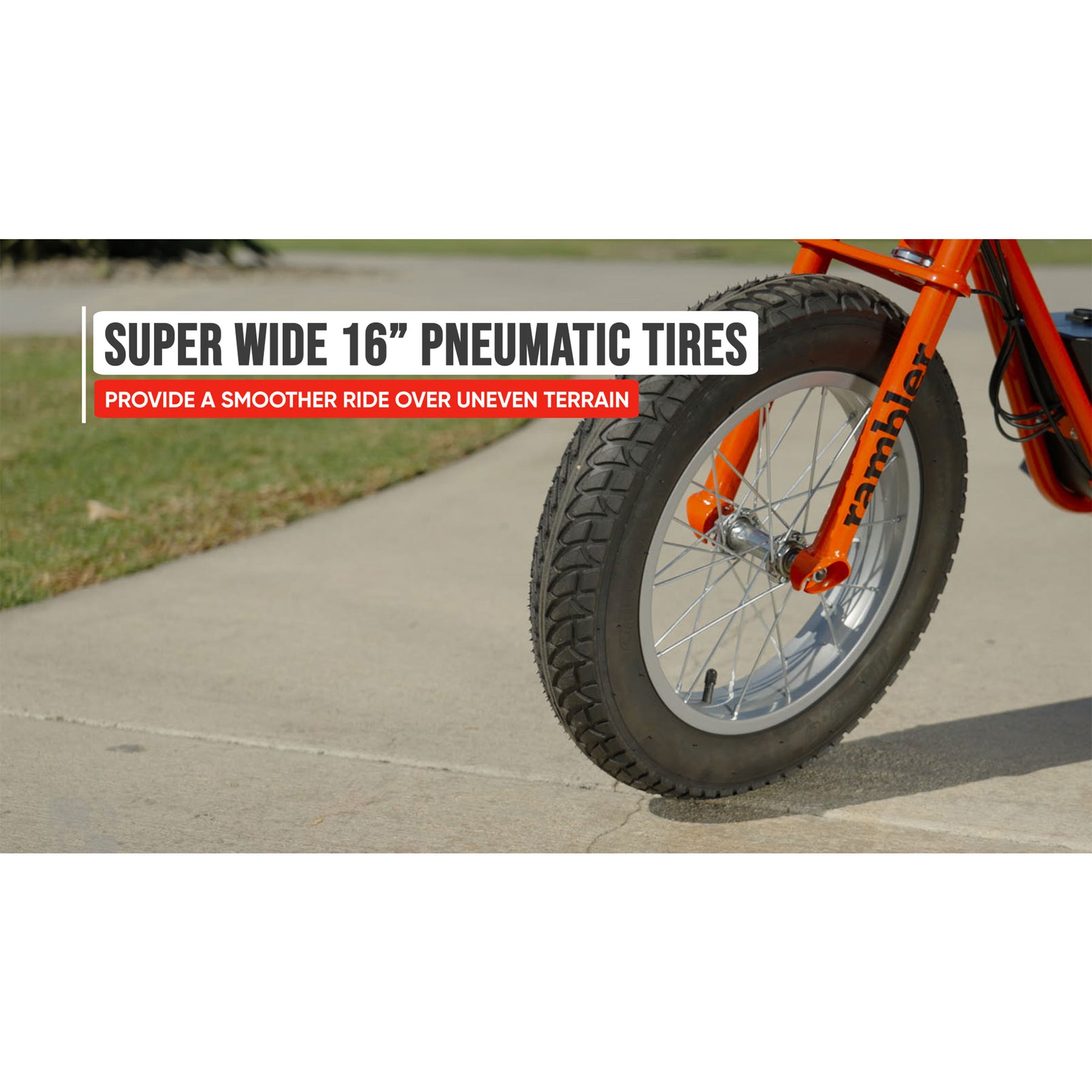 - Equipped with 16-inch fat tires, the Rambler 16 provides a smooth, stable ride on various terrains, from city streets to off-road trails, ensuring comfort and control