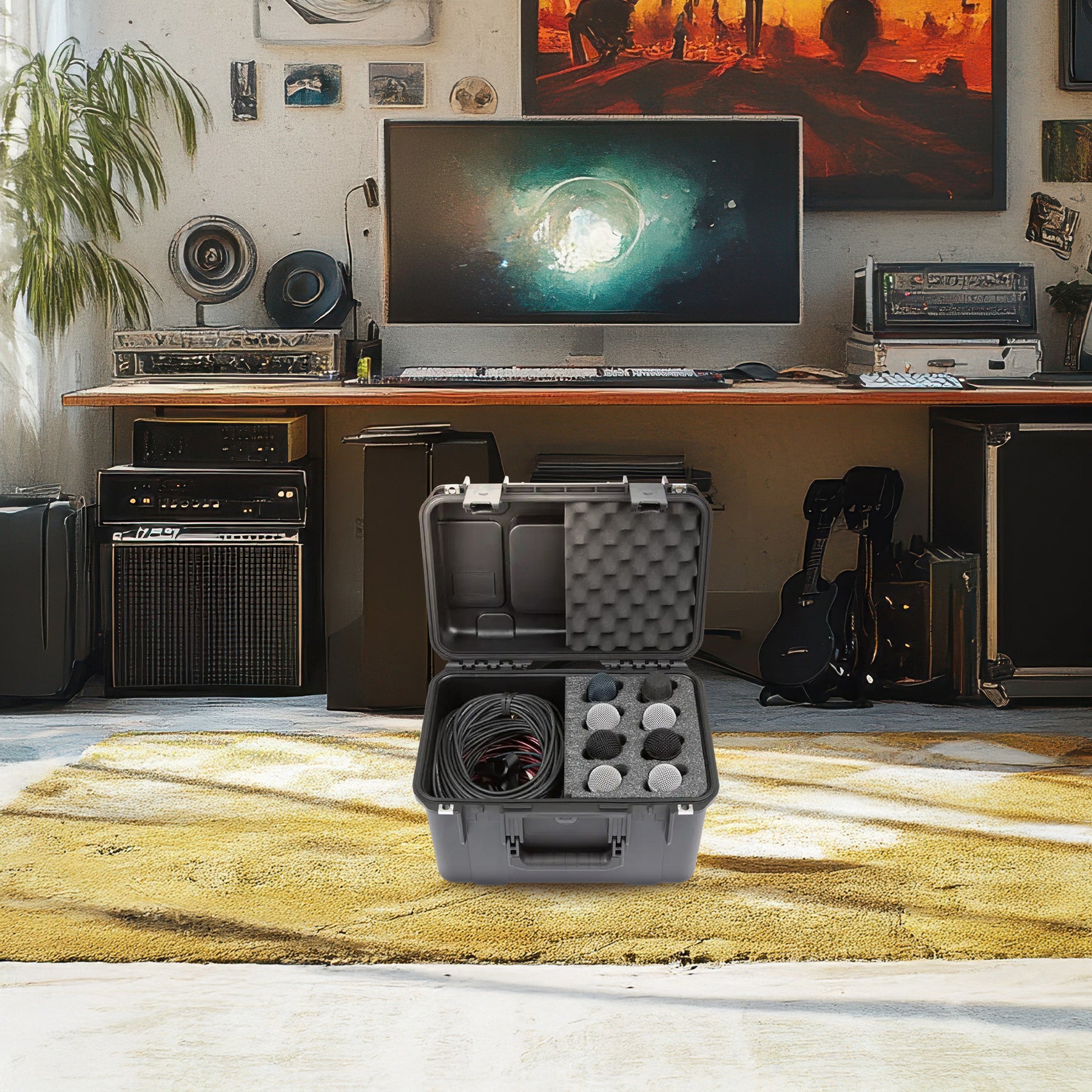 • Holds 8 mics when stored vertically and has extra room for clips, cables, and small accessories