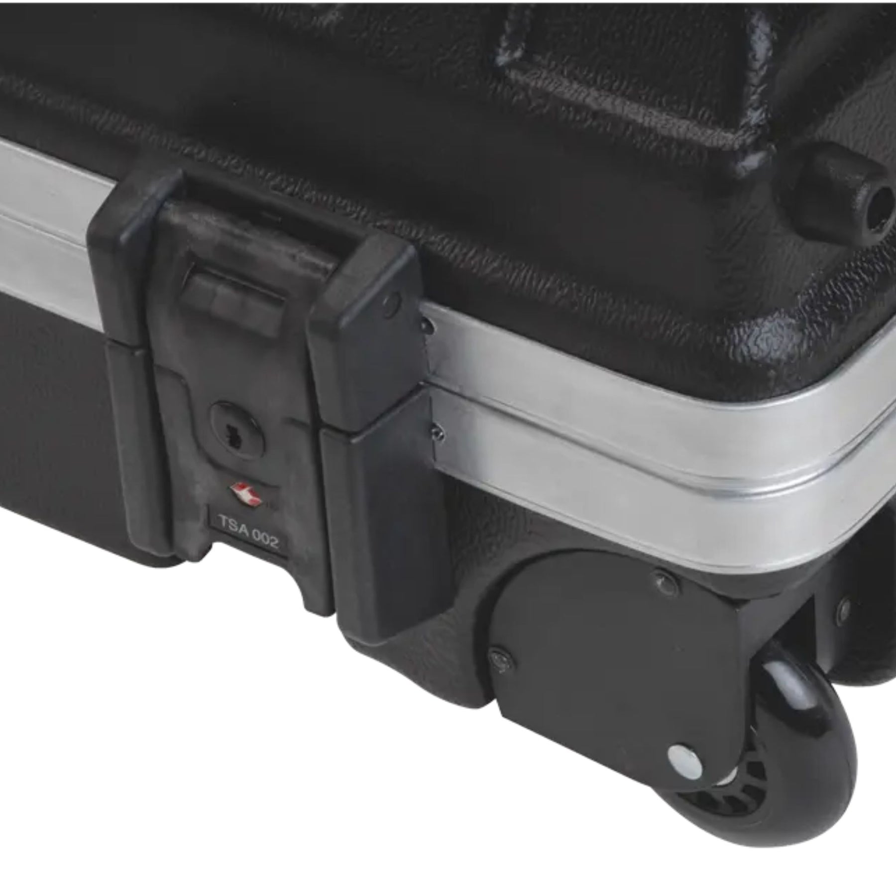 • Rugged wheeled hard case built for safely transporting mic stands, drum hardware, and hardware gear during travel